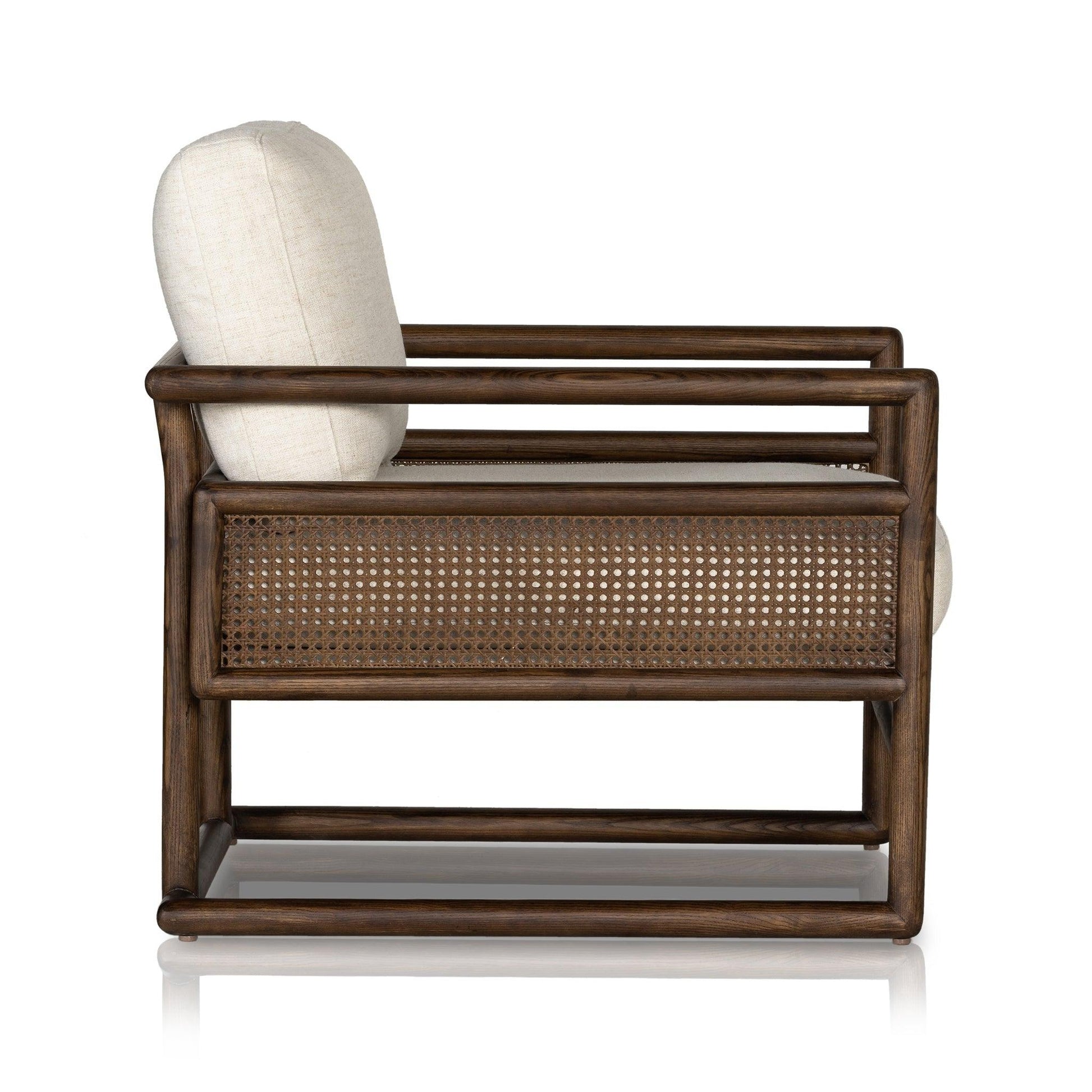 L'inspiration du milieu du siècle rencontre l'esthétique zen apaisante. Des coussins amples et moelleux en mélange de plumes sont recouverts d'un tissu de lin neutre, complétant les panneaux en osier tressé au milieu d'une structure ouverte et angulaire.