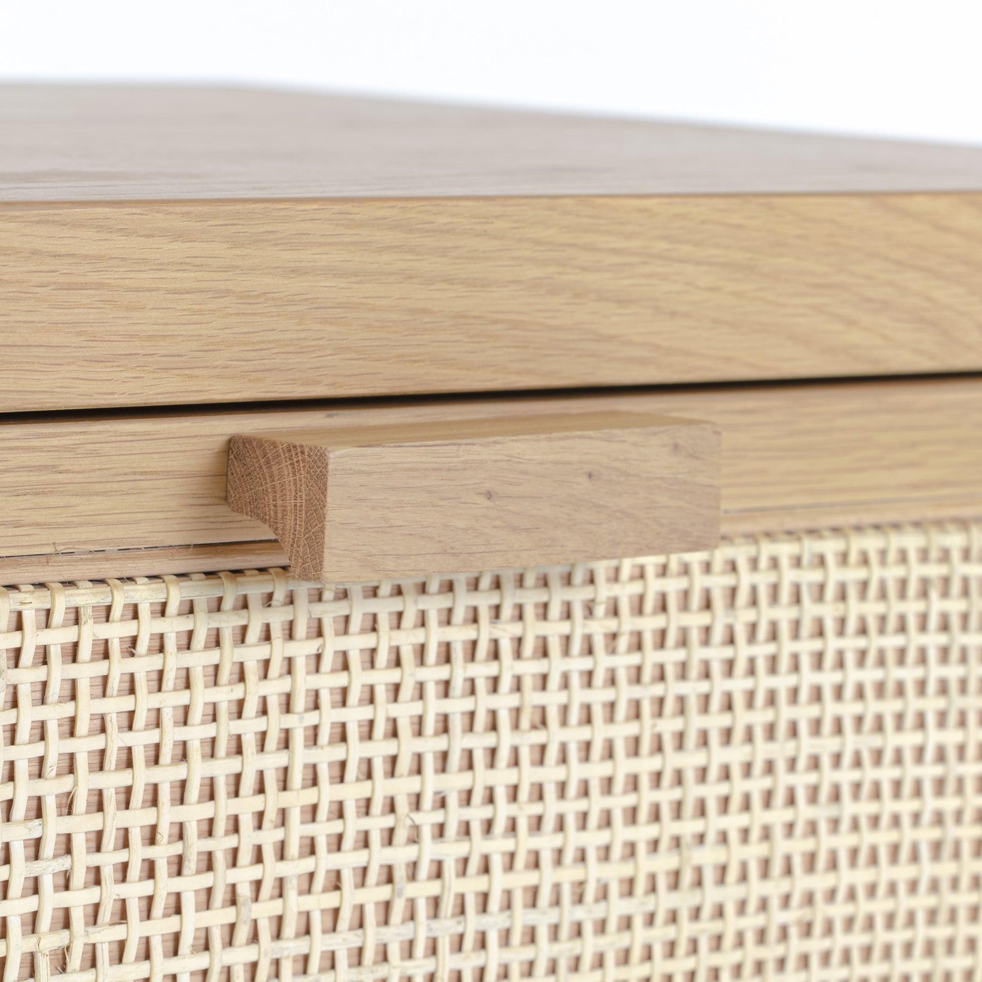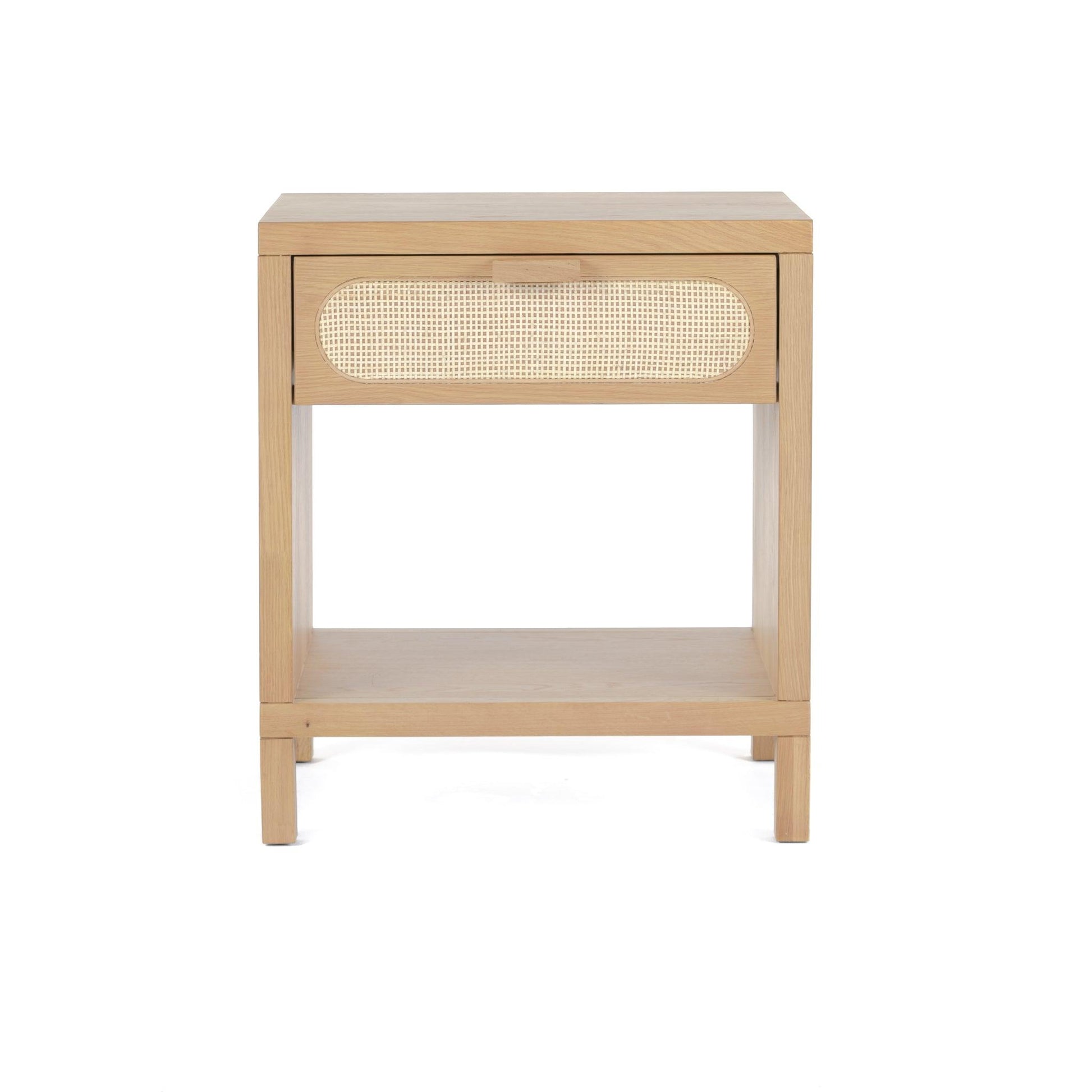 The open shelf of the Benjamin Nightstand allows for an airier feeling, rather than feeling weighed down by excess bulk or unneeded storage. The beautifully woven cane detailing of the top drawer adds texture and warmth to your space.