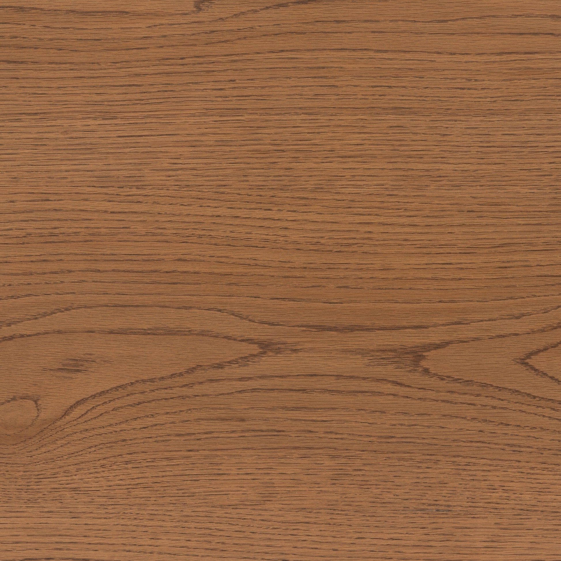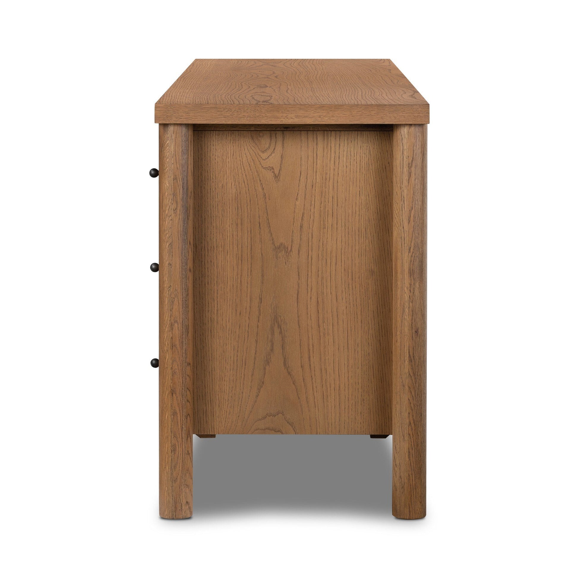 Rounded, chunky dowel legs in an amber oak finish support the overhang top of of this dresser. Six drawers provide ample storage, finished with simple gunmetal hardware.