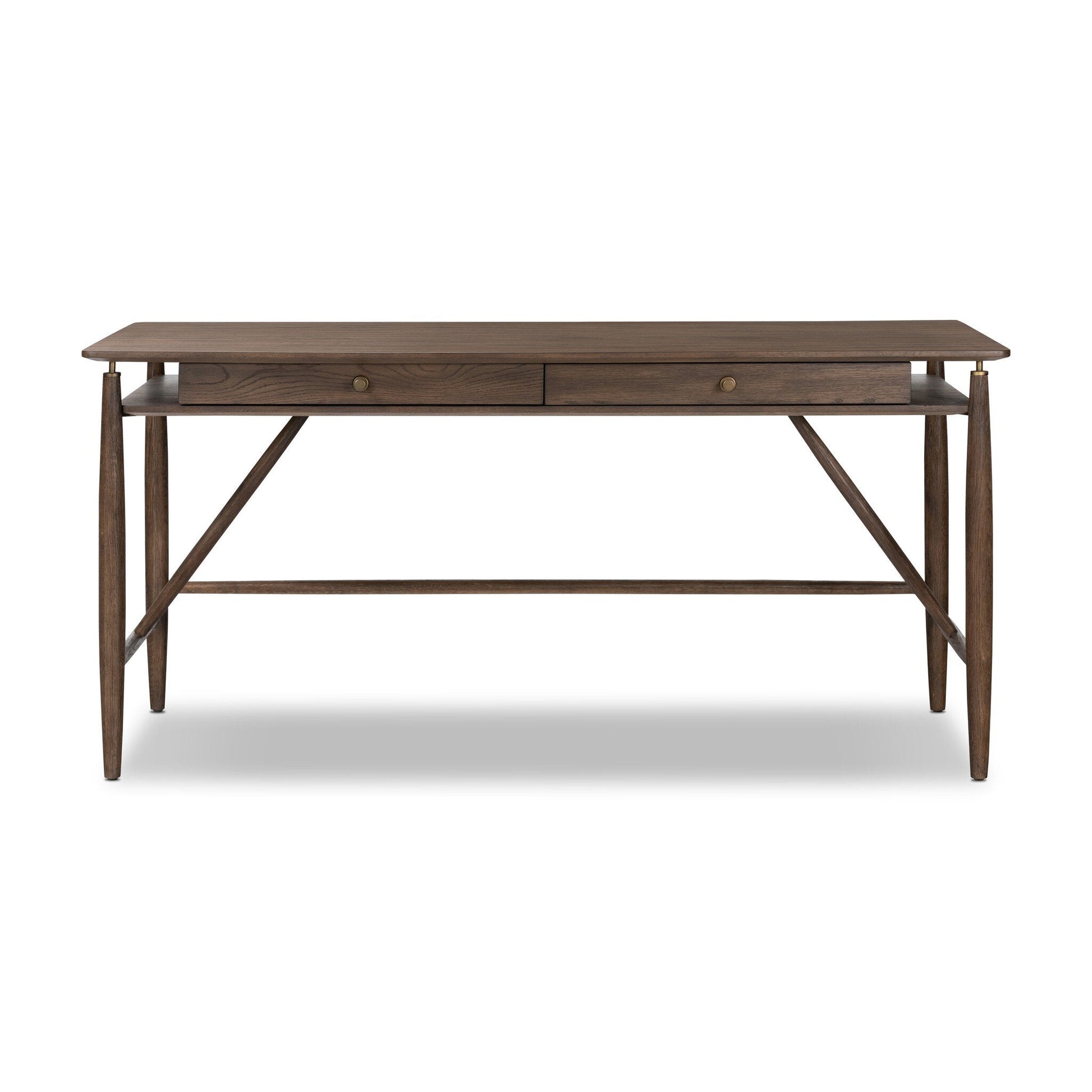 An elegant writing desk of aged oak features turned, cylindrical legs reflective of European antique inspiration.