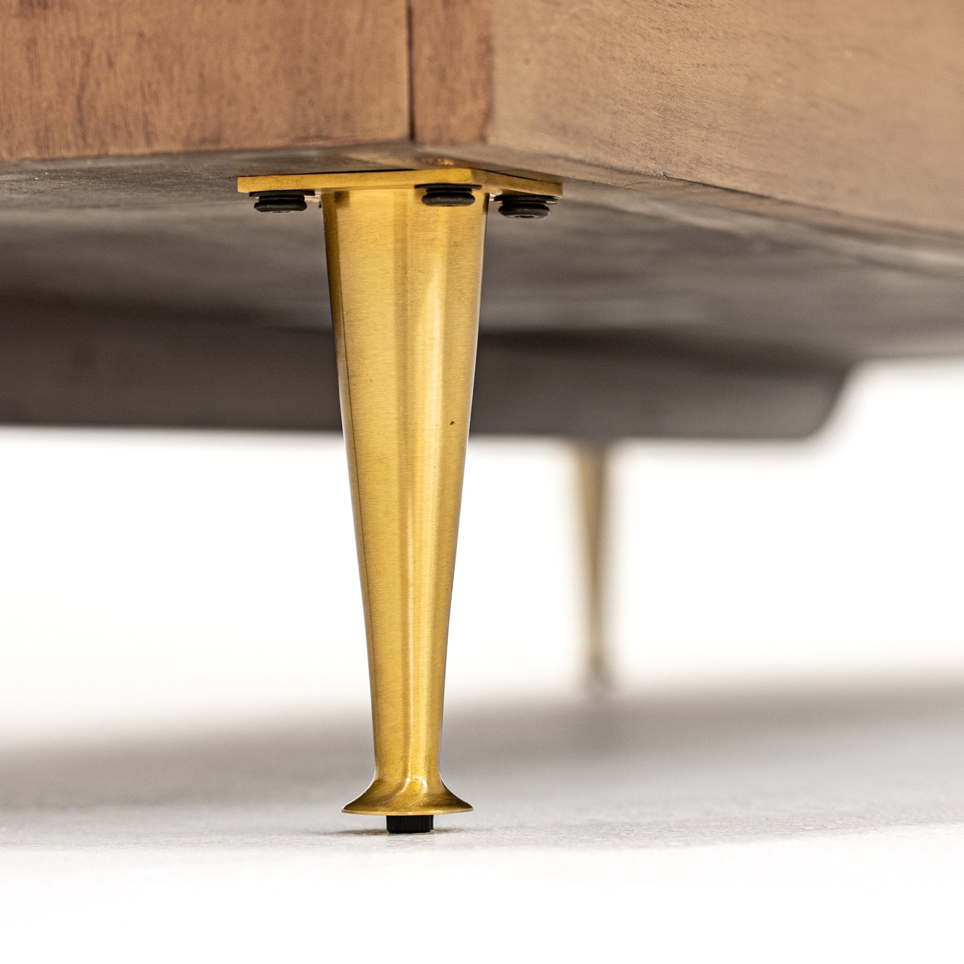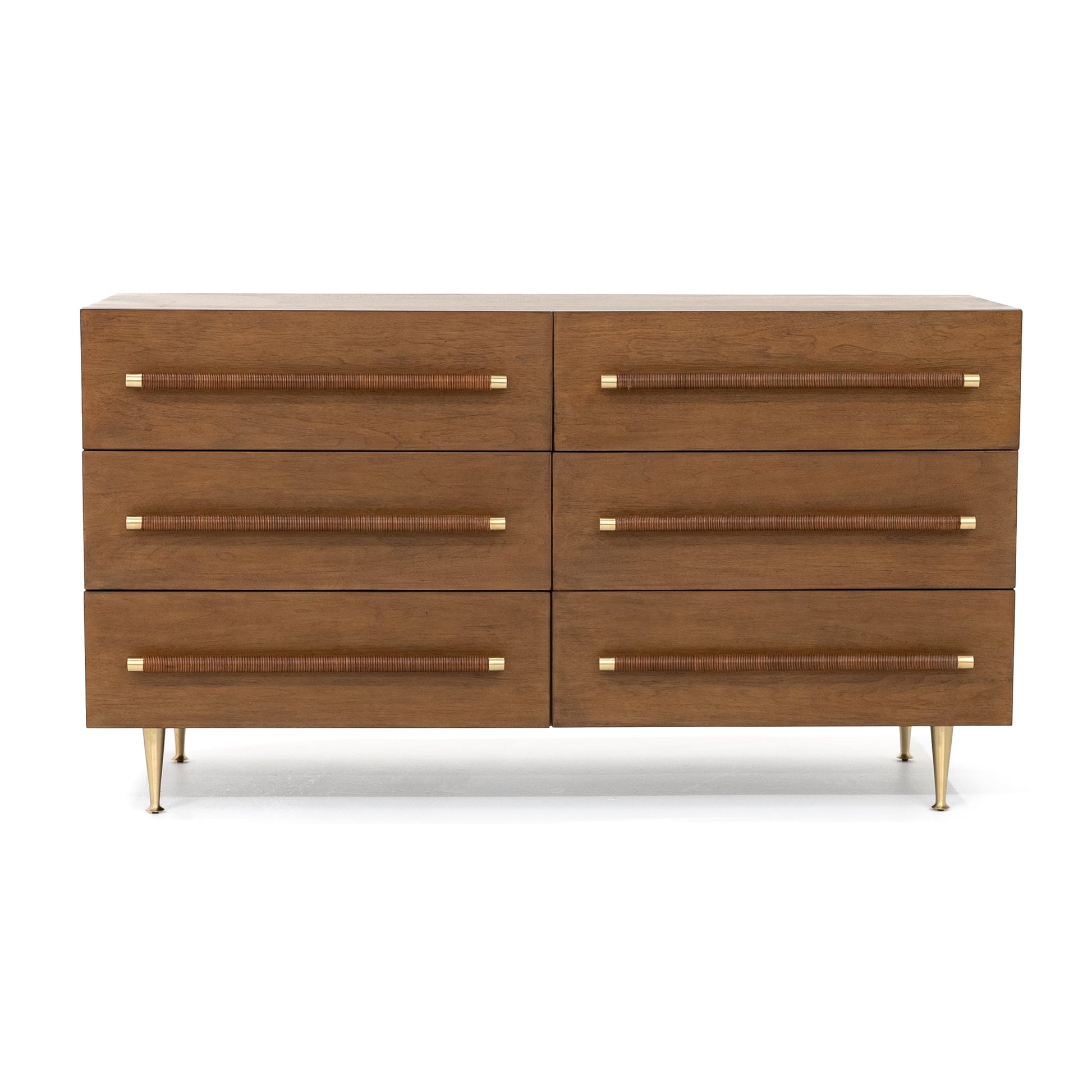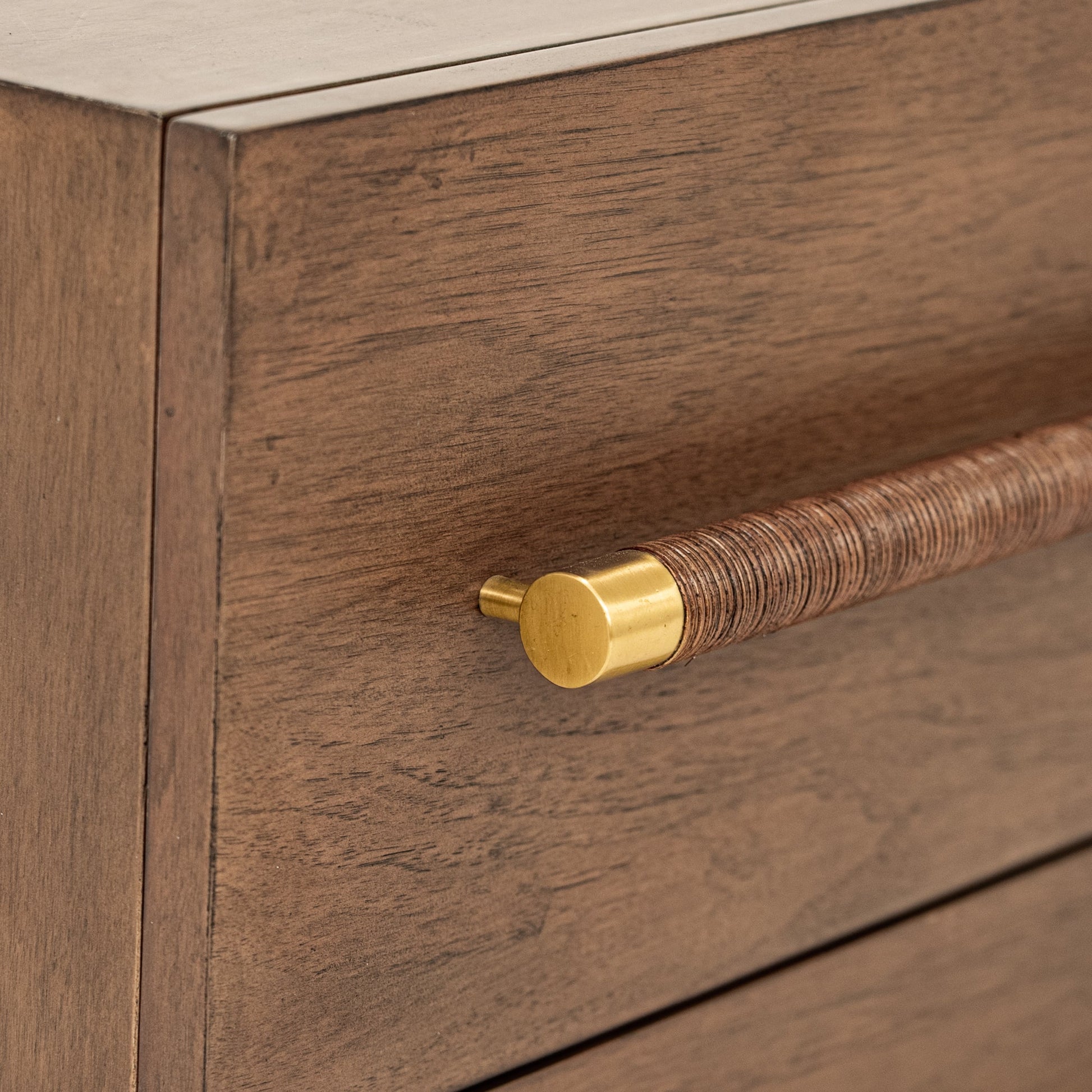 La commode Anderson est fabriquée avec du placage en noyer américain et offre un mélange unique d'éléments classiques et modernes. Ses poignées en laiton, ses façades de tiroirs en rotin à motifs et sa finition en caramel créent un look intemporel et contemporain.