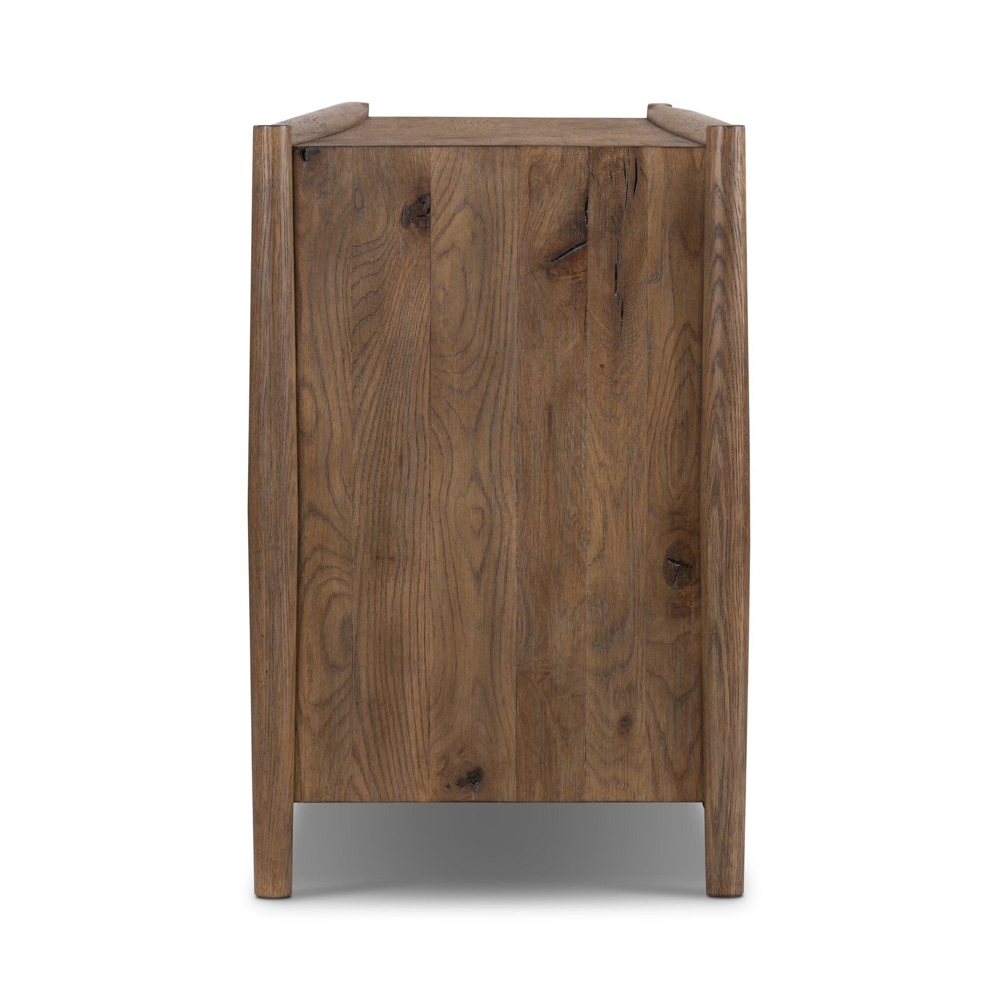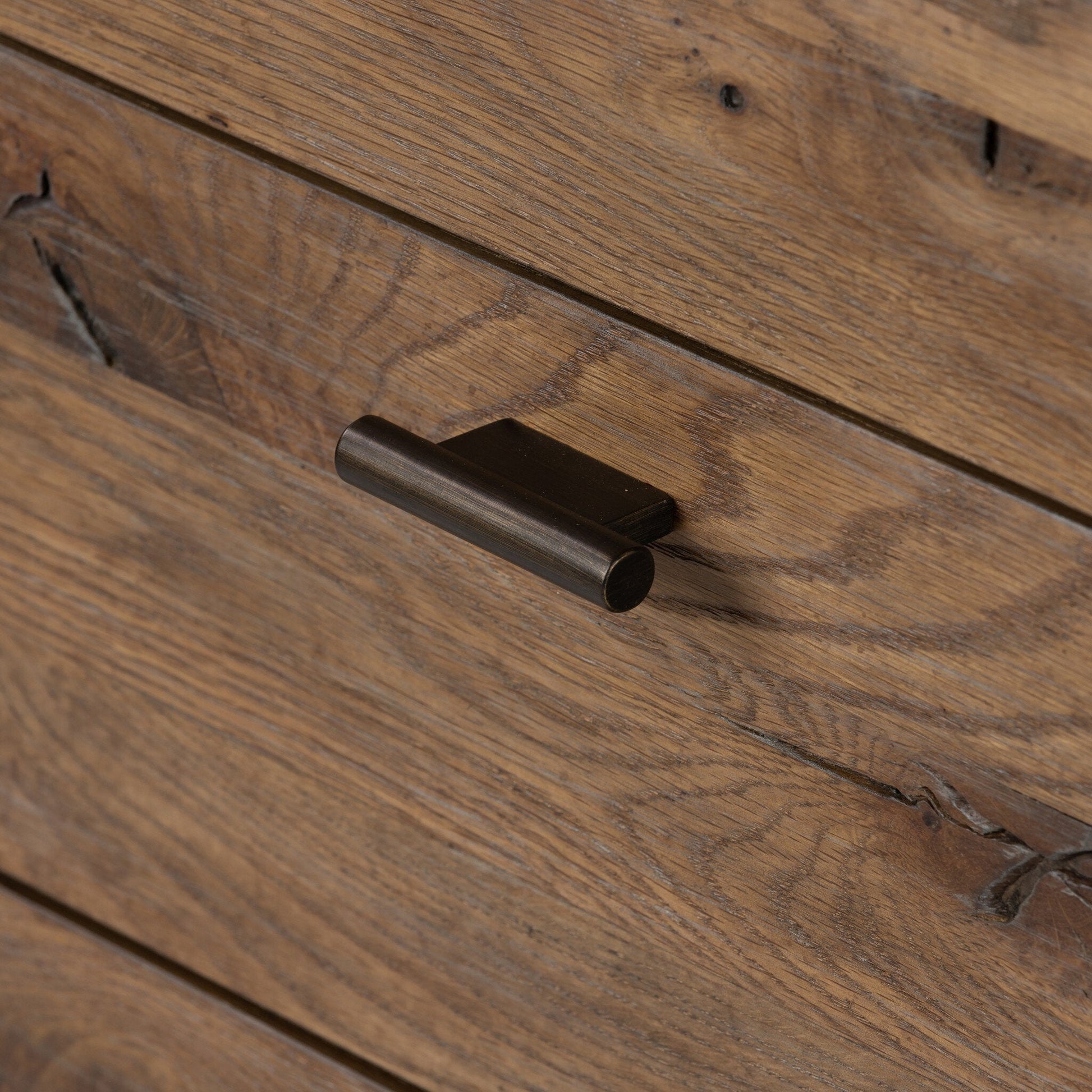 The traditional spindle structure brought to modern speed. Made from weathered oak with a light, rustic finish, nine spacious drawers bring generous storage space to the bedroom. Simple cylindrical hardware is finished in an aged bronze.