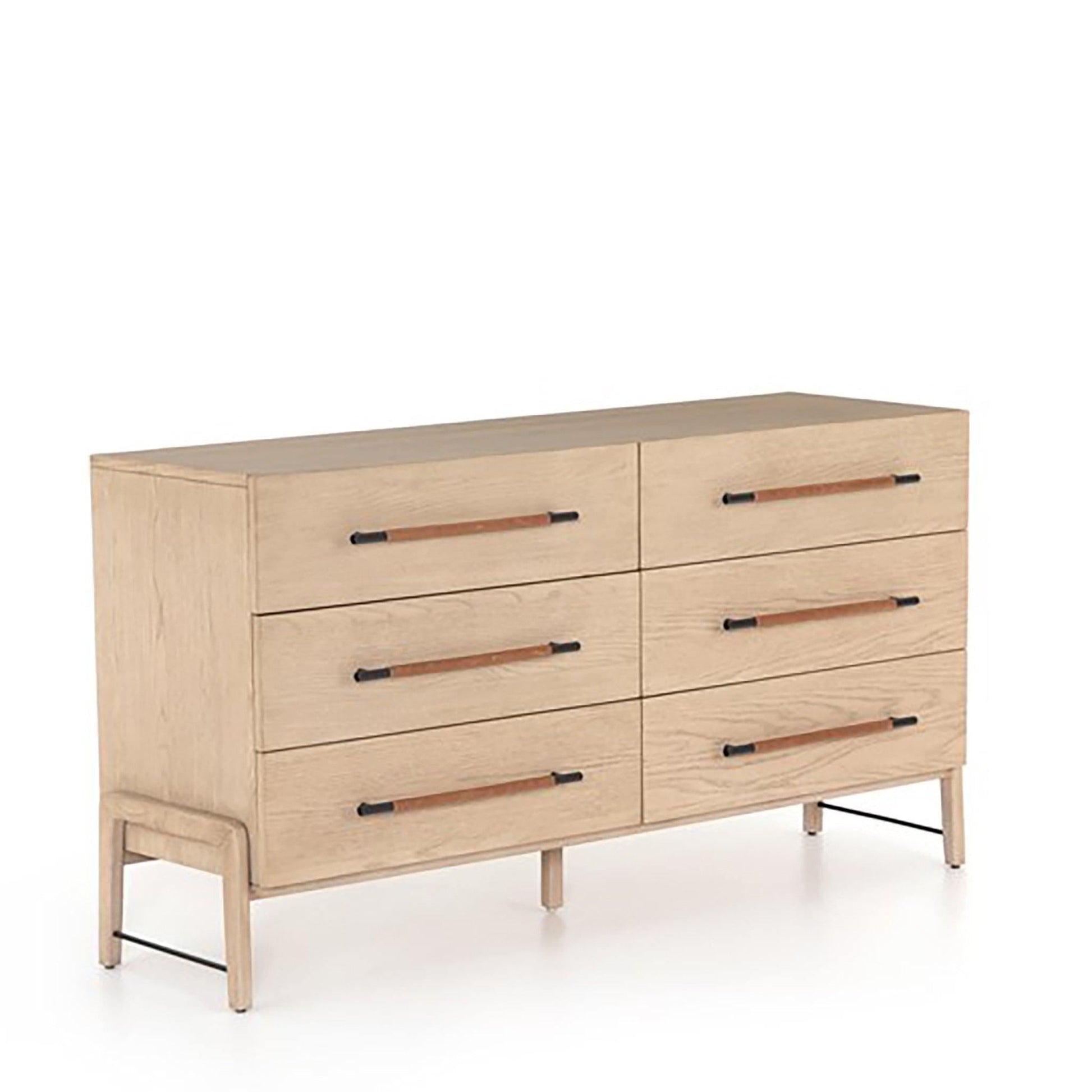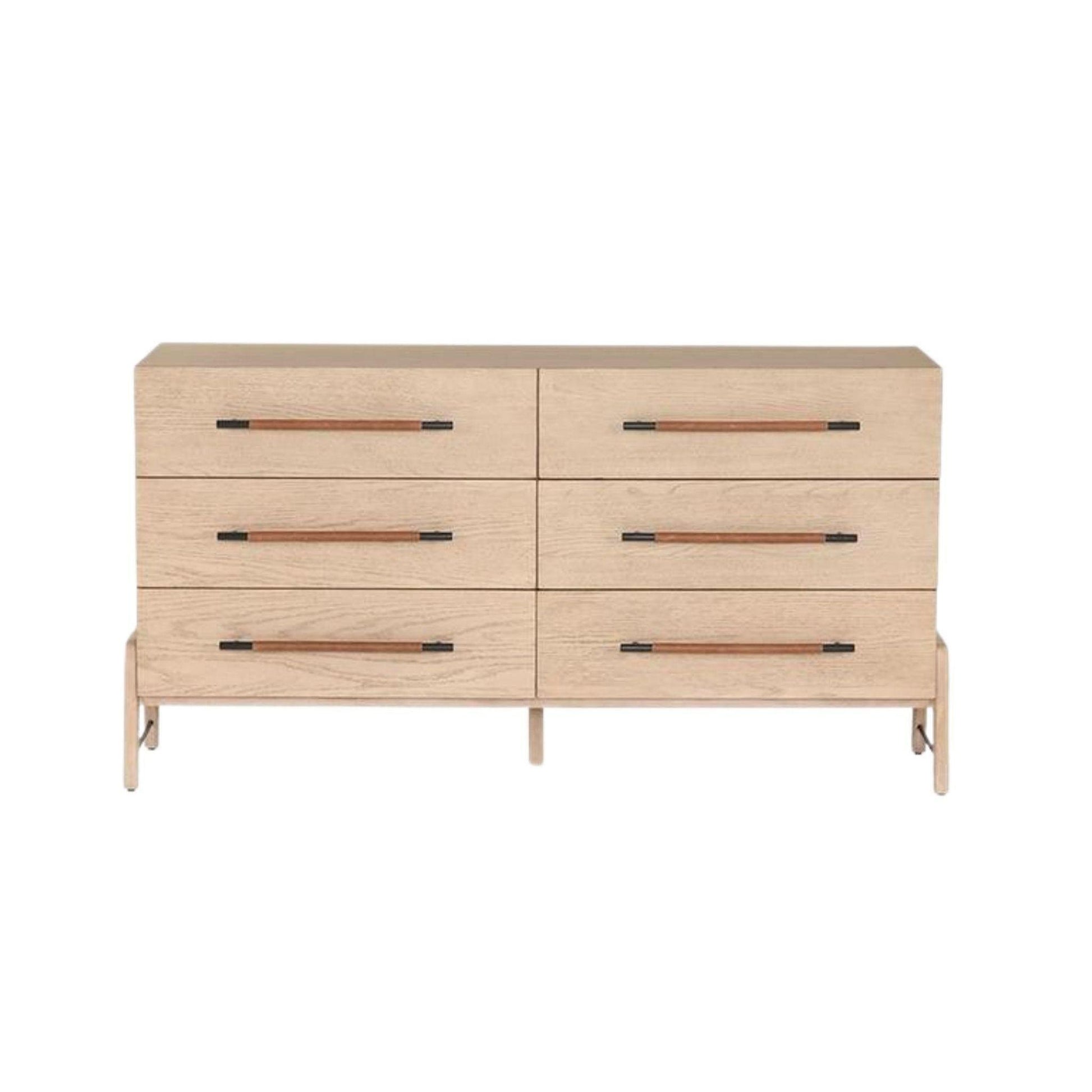 Rehaussez le style de votre commode avec la Tracy. Fabriquée avec soin en chêne clair pour former une silhouette élégante, cette commode, dotée de six grands tiroirs accentués de ferrures en cuir pleine fleur marron clair, offre un look classique, intemporel et accueillant.
