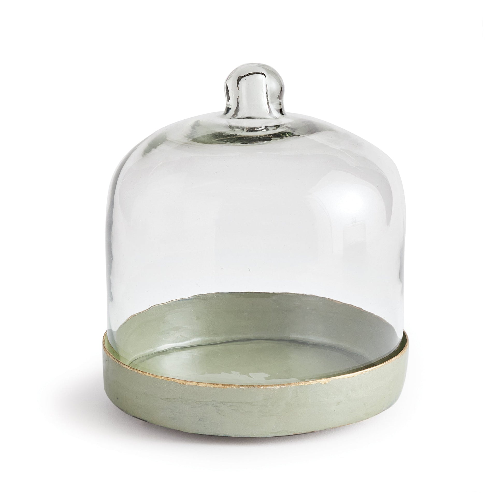 Un élégant mariage de forme et de fonction : le plateau Kammie avec cloche présente un fini émail vert doux bordé d'une feuille d'or qui encadre une cloche en verre martelé à la forme légèrement bombée. Il évoque un objet de famille discret, prêt à célébrer les moments quotidiens, que ce soit pour présenter des pâtisseries, des souvenirs ou des trésors de saison, tout en apportant beauté et utilité à votre table.