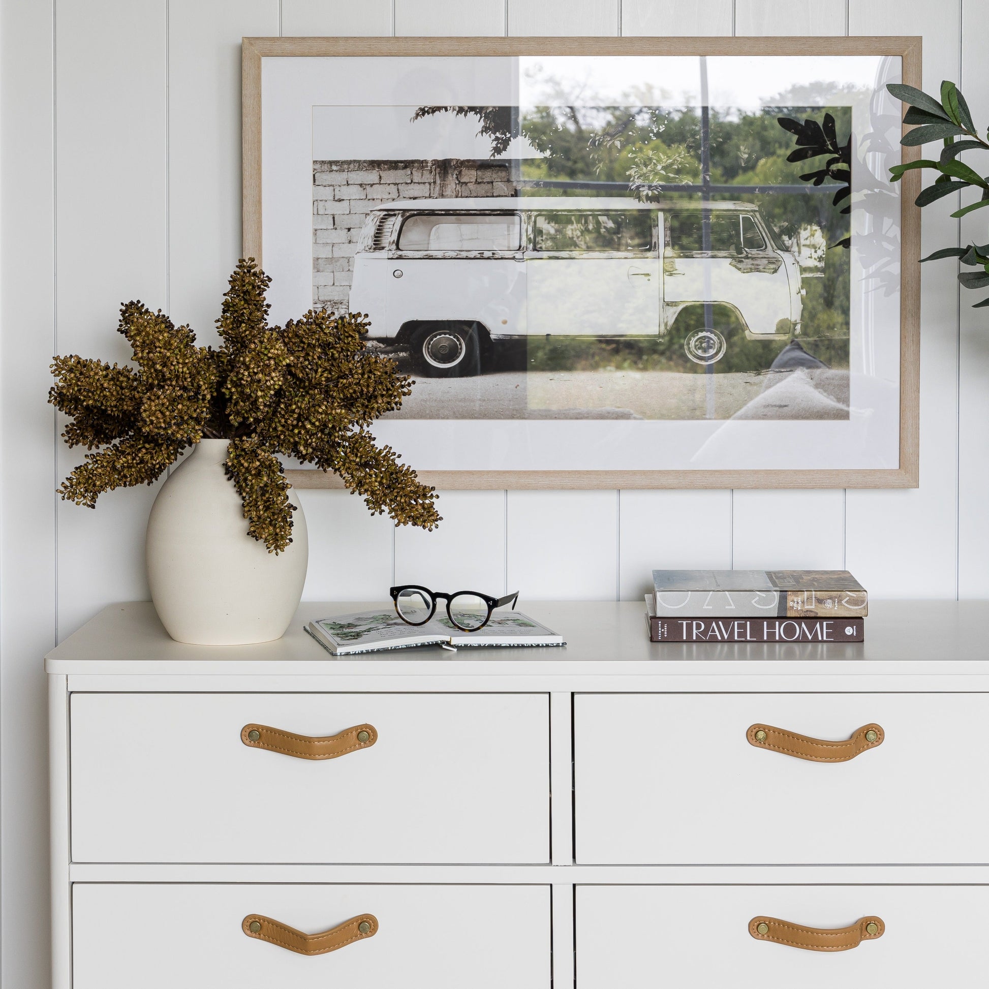 Encadrée dans un cadre en adobe naturel, c'est une photographie classique en noir et blanc.