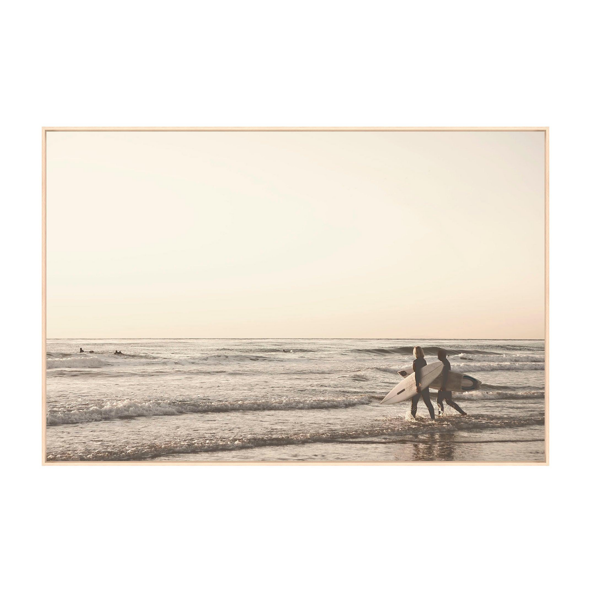 Encadrée dans un cadre en adobe naturel, c'est une photographie classique de surfeurs.