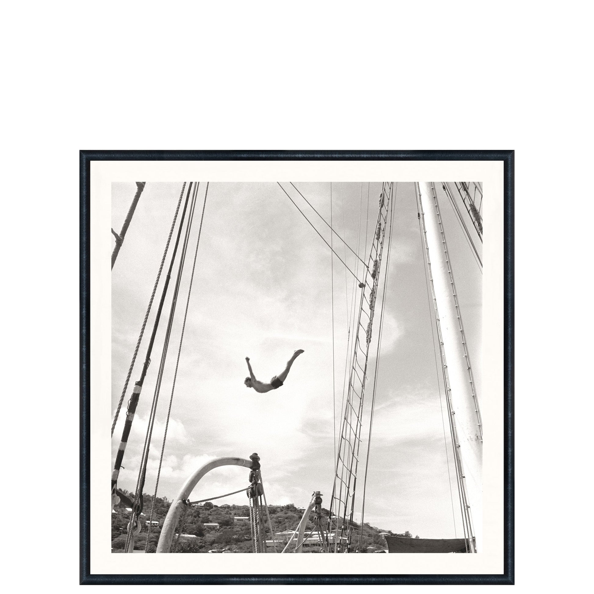 Revivez la beauté vintage de la voile avec la collection Nostalgia - From the Mast 1962. Cette photographie vous ramènera à une époque révolue, en vous montrant la nostalgie des plongeons du mât et le frisson de vous jeter à l'eau.
