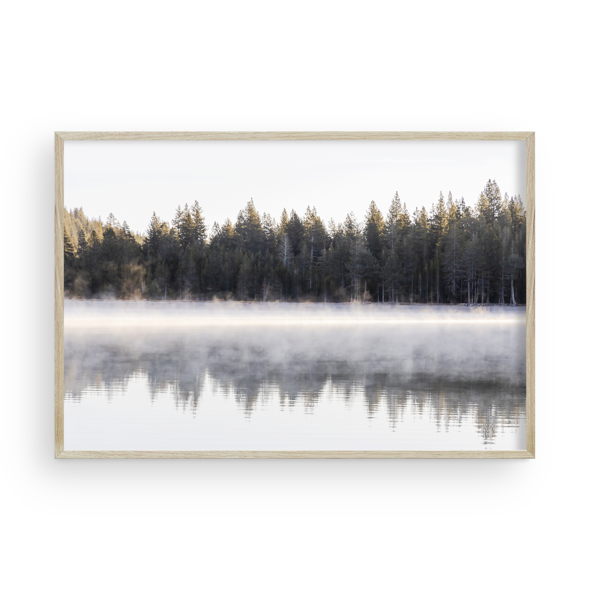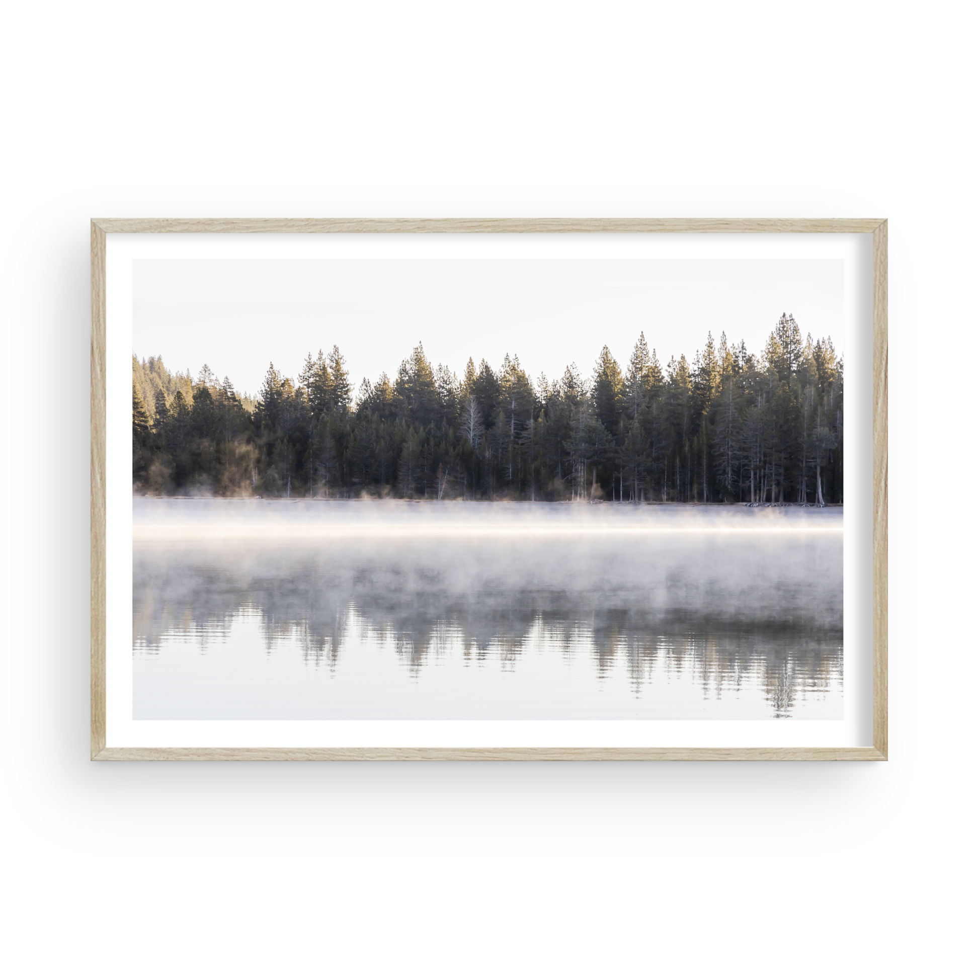 Tranquillité et atmosphère se rencontrent dans *Brume du Tahoe*, une photographie paisible de Caroline Pacula. Capturée sur les rives du lac Tahoe, cette image présente des eaux calmes s'estompant dans un brouillard léger, avec des pins lointains à peine visibles à travers la brume. Les tons subtils et l'ambiance sereine invitent à un moment de pause et de réflexion.