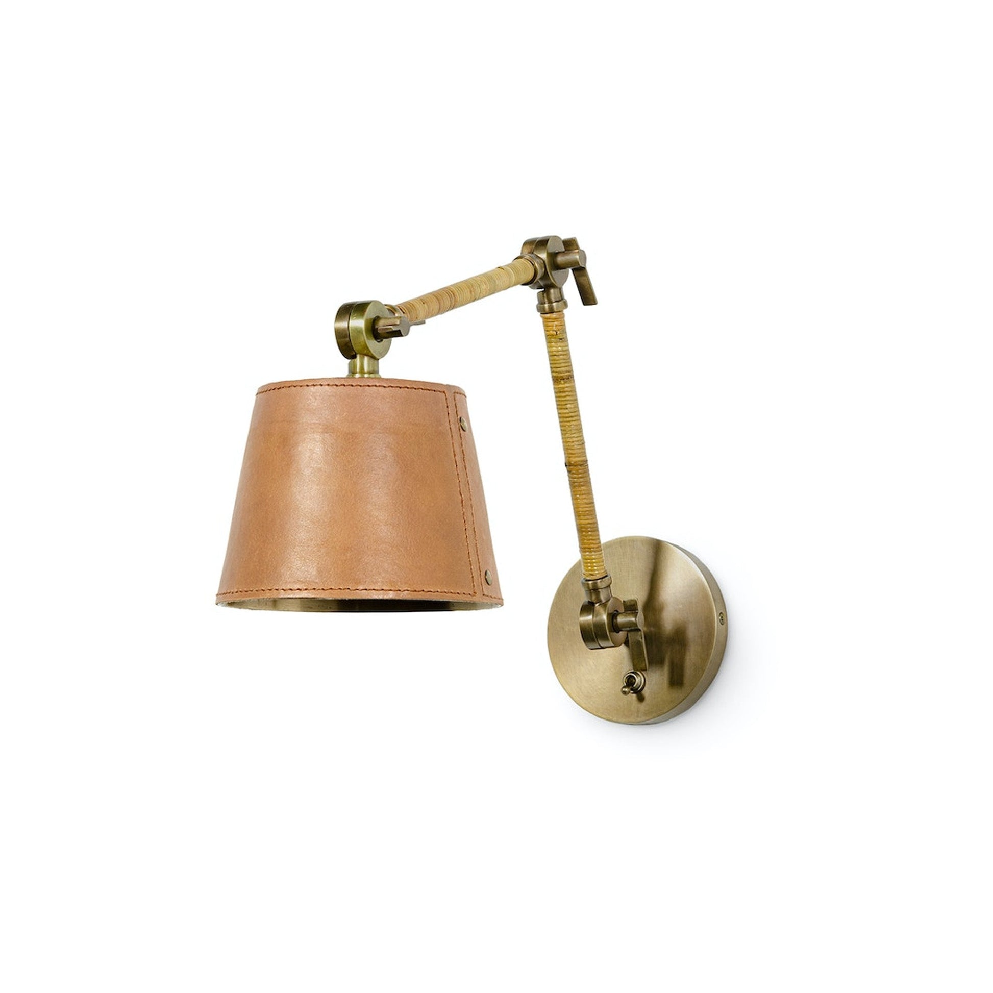 L'abat-jour en métal est recouvert de cuir à la main et accentué de rivets en laiton. Le corps articulé en métal est fini en laiton antique et présente des détails en rotin tressé à la main. L'applique murale est livrée avec une plaque de fixation arrière en métal fini en laiton antique. Une installation professionnelle est recommandée.