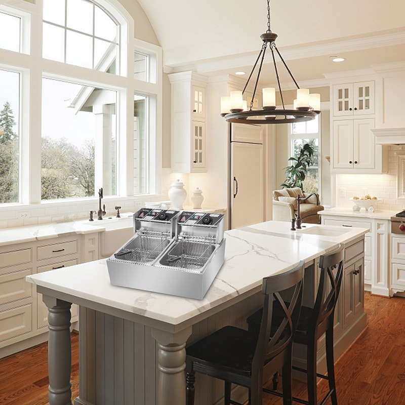 Ce friteuse électrique est idéale pour cuire des frites, des oignons frits, des rouleaux de printemps, du poulet frit, des crevettes panées et tous autres aliments frits. Elle est fabriquée en acier inoxydable robuste et possède une finition noire. Cette friteuse est dotée de deux éléments chauffants et de deux prises électriques pour une cuve unique de grande capacité.