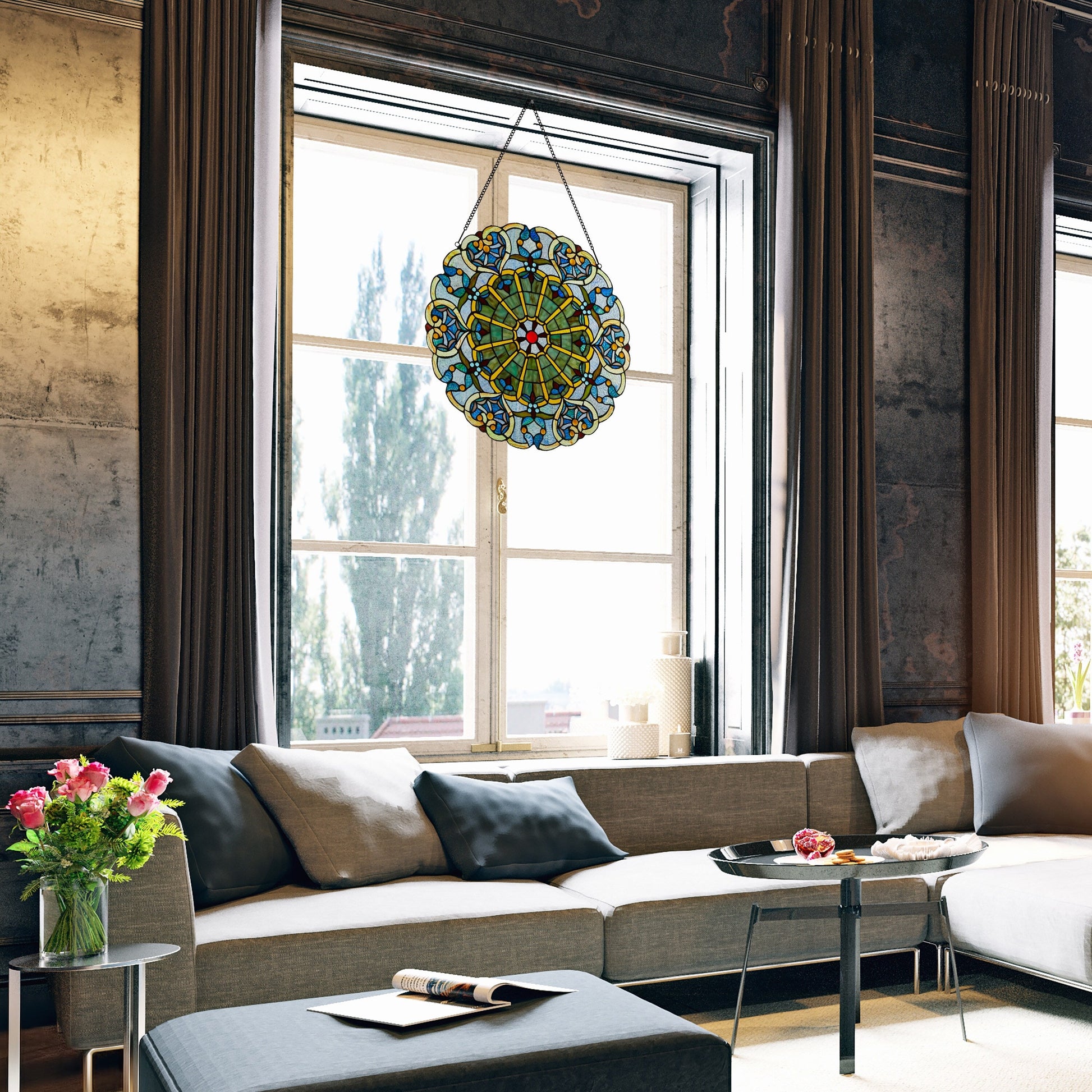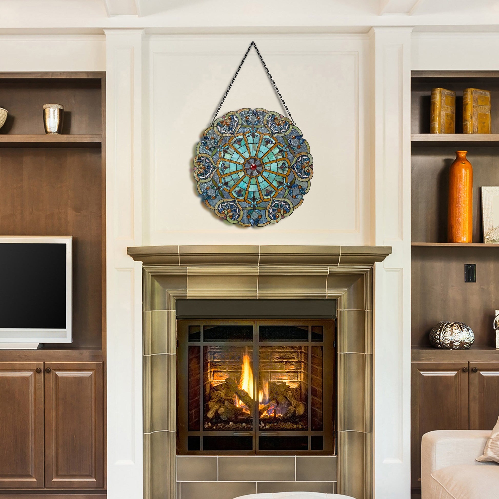 Ajoutez une touche de tradition et d'élégance à n'importe quelle pièce avec ce panneau de vitre vitrail de 56 cm (22 pouces) d'inspiration victorienne. Présentant un magnifique motif de cœur en forme de toile d'araignée dans des teintes de bleu riches, ce panneau est un véritable sujet de conversation. Fabriqué à partir de verre teinté artisanal, il capte et reflète magnifiquement la lumière, créant un jeu de couleurs enchanteur lorsqu'il est placé dans une fenêtre ensoleillée. Il est livré avec une chaîne de suspension de 76 cm (30 pouces) pour une installation facile. Le panneau est facile à nettoyer, ne nécessitant qu'un chiffon humide ou un polish à l'huile de citron et un chiffon doux et sec pour conserver ses couleurs vibrantes.