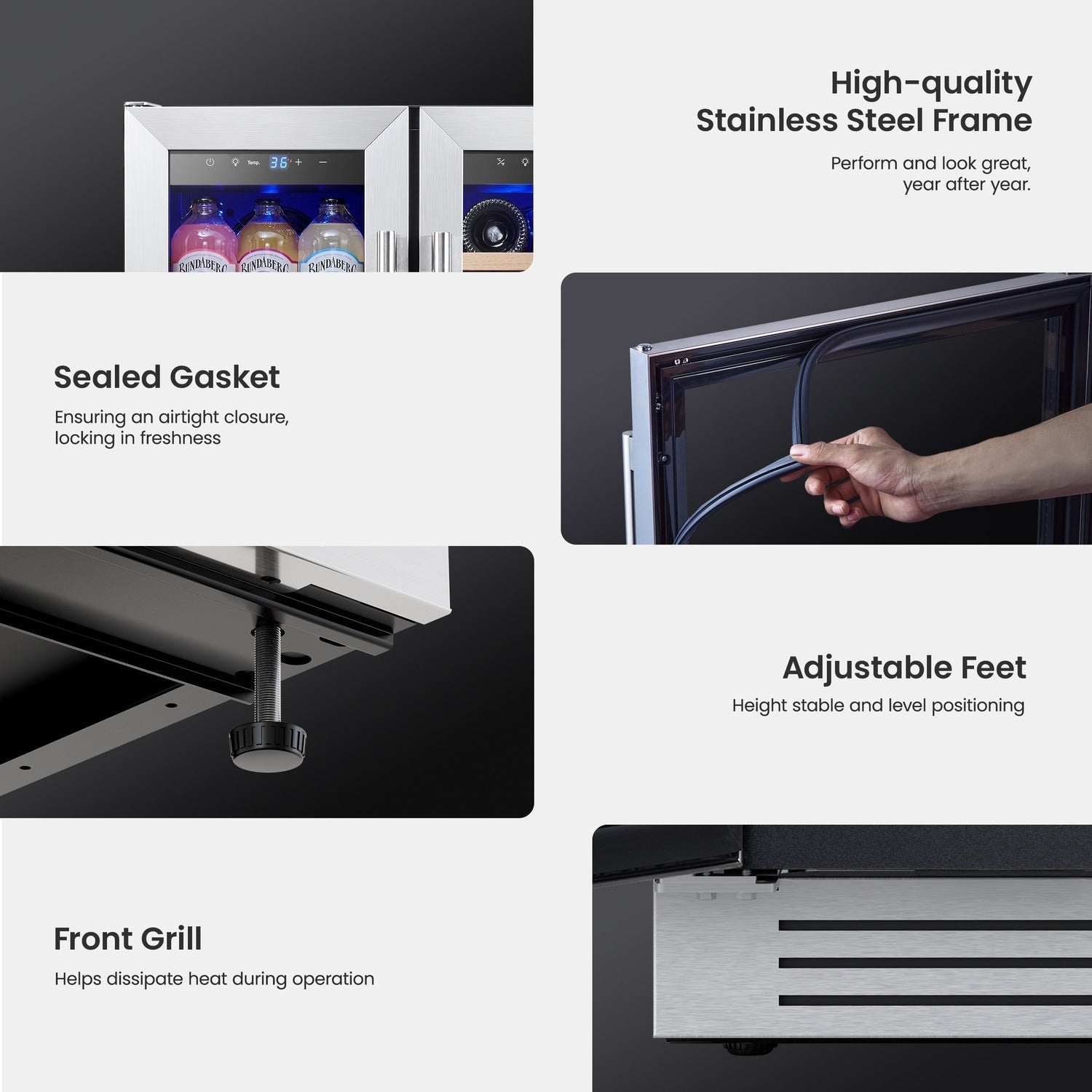 Installation silencieuse et flexible : fonctionnant à un niveau sonore extrêmement faible de 42 décibels, le refroidisseur à vin et boissons Yeego assure une ambiance paisible tout en gardant vos boissons parfaitement fraîches. Le refroidisseur peut être installé comme unité autonome ou encastrable, offrant une flexibilité pour s'adapter à n'importe quelle configuration de cuisine ou décoration intérieure. La fonction de dégivrage automatique ajoute encore plus de commodité, assurant un entretien sans tracas de votre réfrigérateur à vin et boissons.