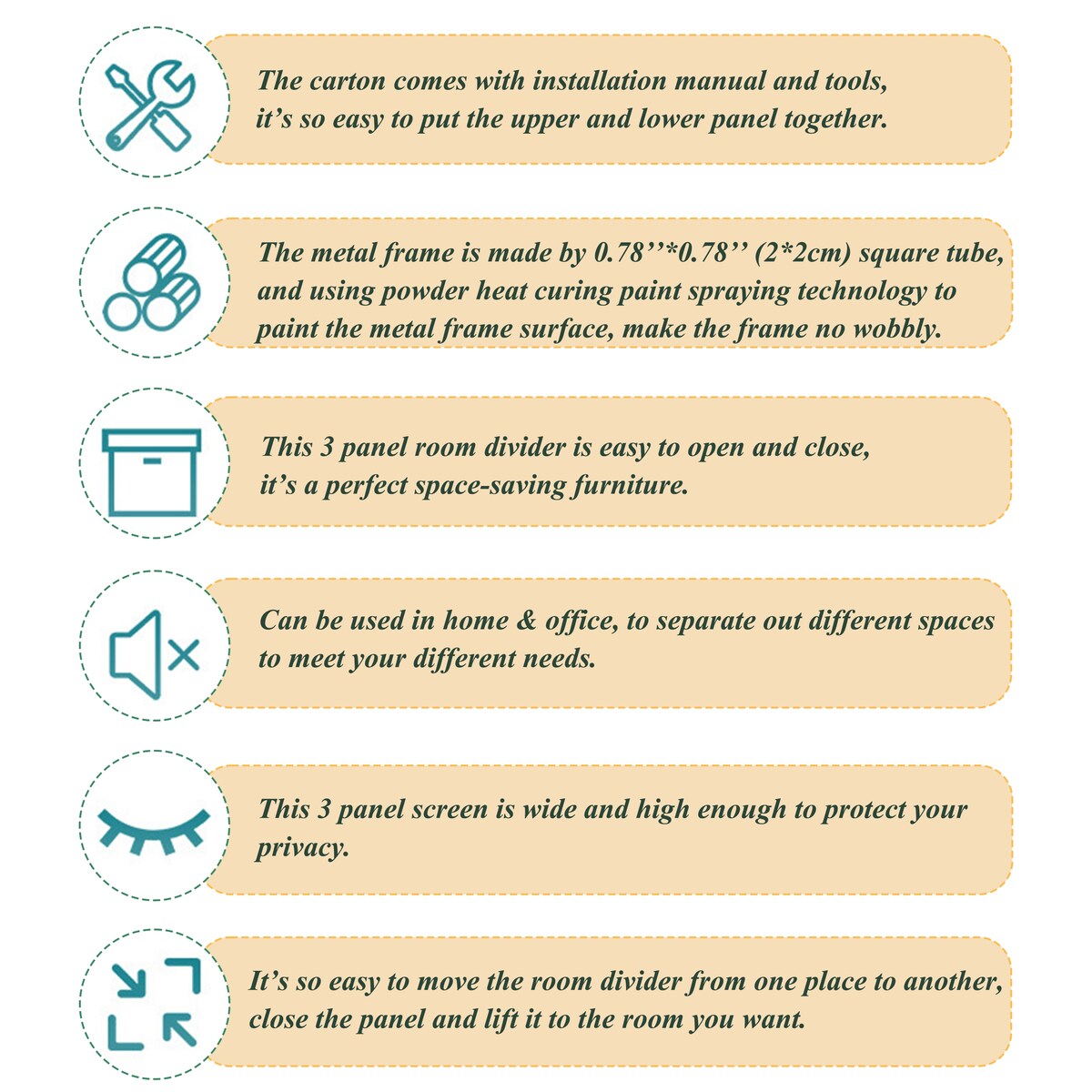 Transformez votre espace de vie avec notre magnifique séparateur de pièce à 3 panneaux, un ajout polyvalent et élégant à votre décoration intérieure. Fabriqué à partir de métal et de bois de paulownia de haute qualité, ce séparateur de pièce indépendant possède une belle esthétique rustique qui s'intègre parfaitement à tous les styles de maison. Idéal pour créer des espaces séparés pour le travail, les jeux ou la détente, notre séparateur de pièce est incroyablement facile à déplacer et peut être utilisé dans diverses pièces, y compris le salon, la chambre à coucher, la salle à manger, le bureau et le balcon.