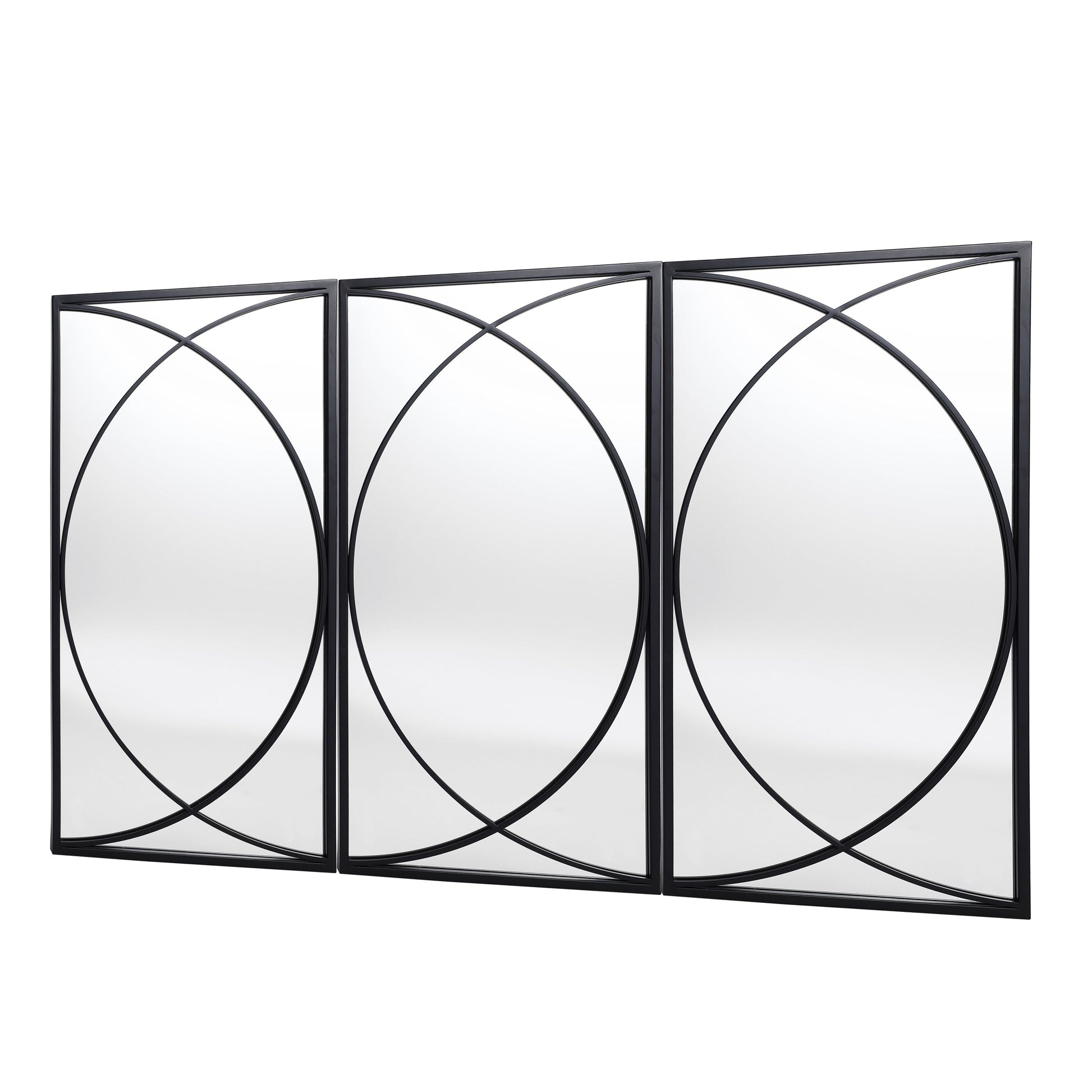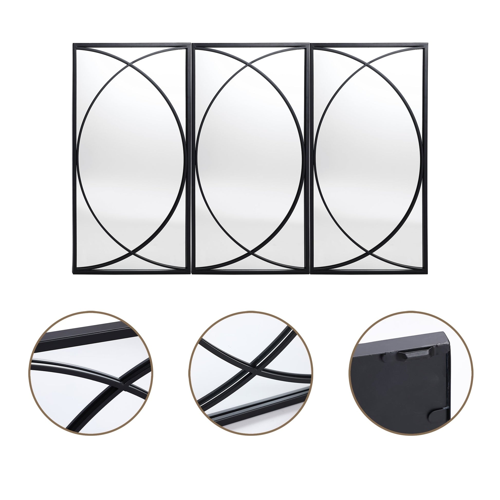 Sublimez votre espace de vie avec ces miroirs muraux rectangulaires en métal noir de qualité supérieure. L'ensemble comprend trois miroirs au design contemporain qui peuvent être disposés ensemble ou séparément à différents endroits pour ajouter une touche personnalisée à votre décoration. Les miroirs possèdent une surface en verre de haute qualité qui offre des reflets cristallins, ce qui les rend parfaits à la fois pour des usages fonctionnels et décoratifs. Le magnifique design moderne présente deux demi-cercles qui se croisent au milieu, vous permettant de les combiner selon vos besoins et votre créativité.