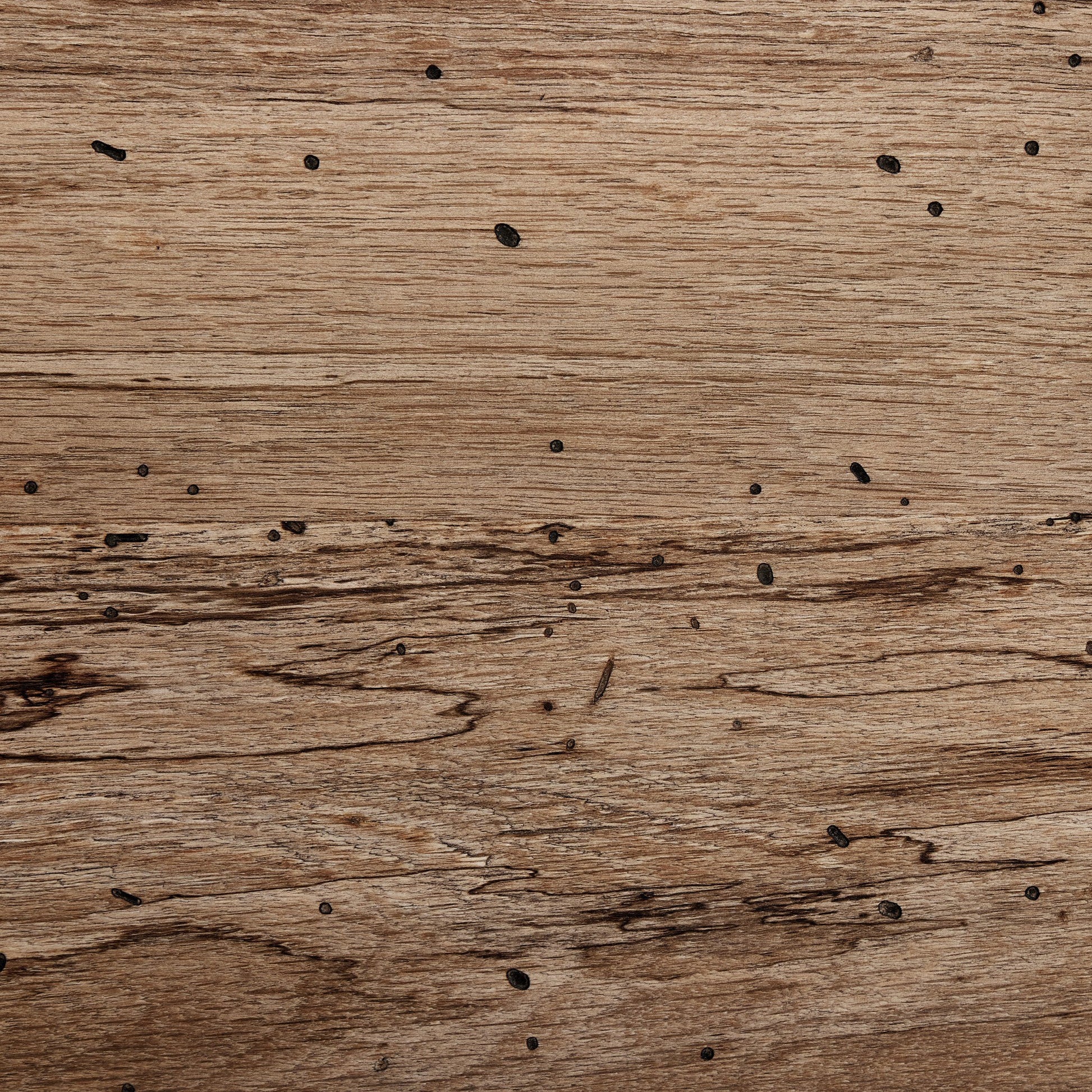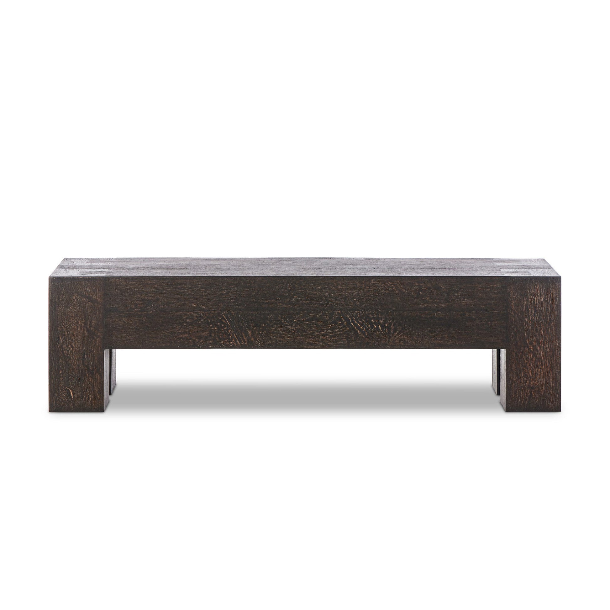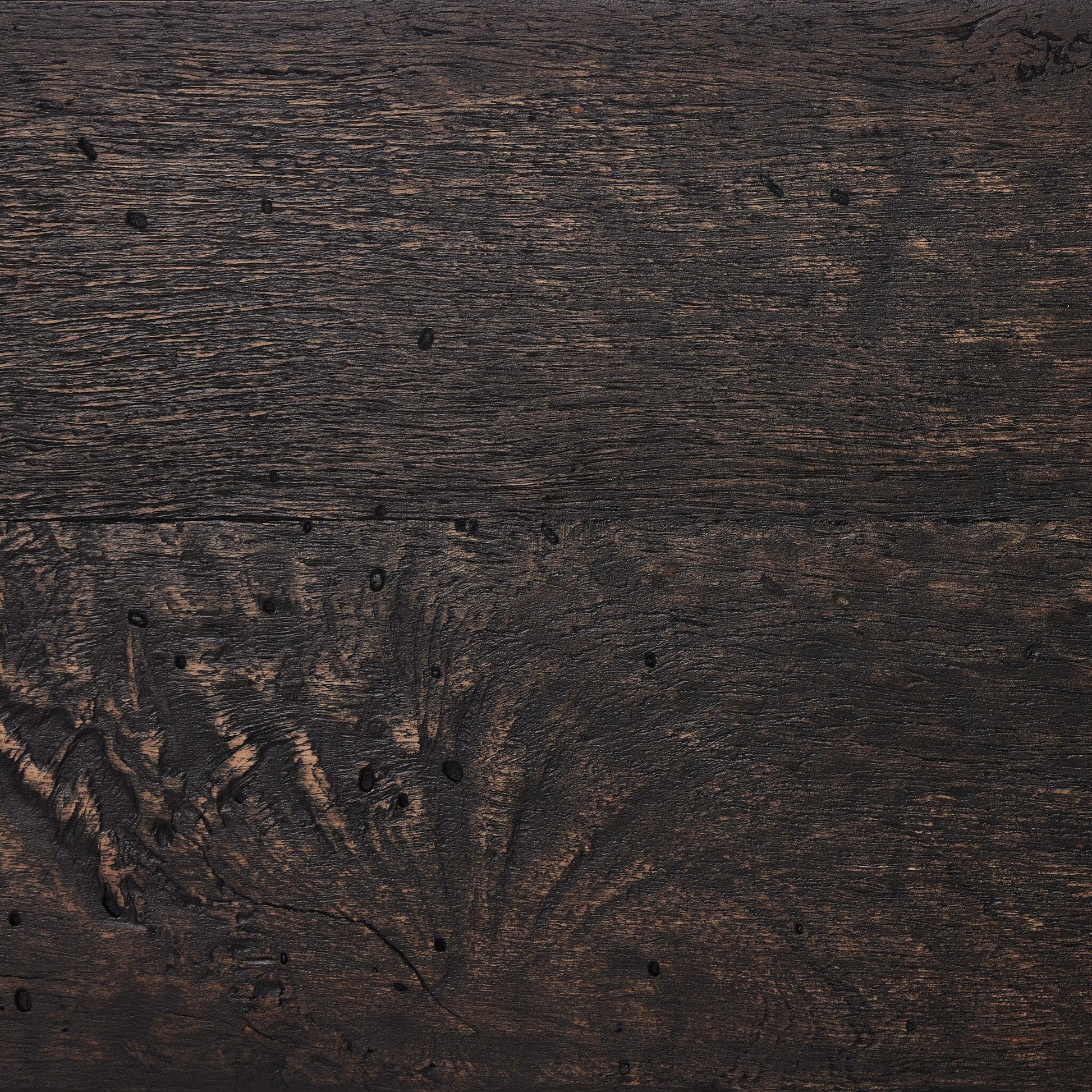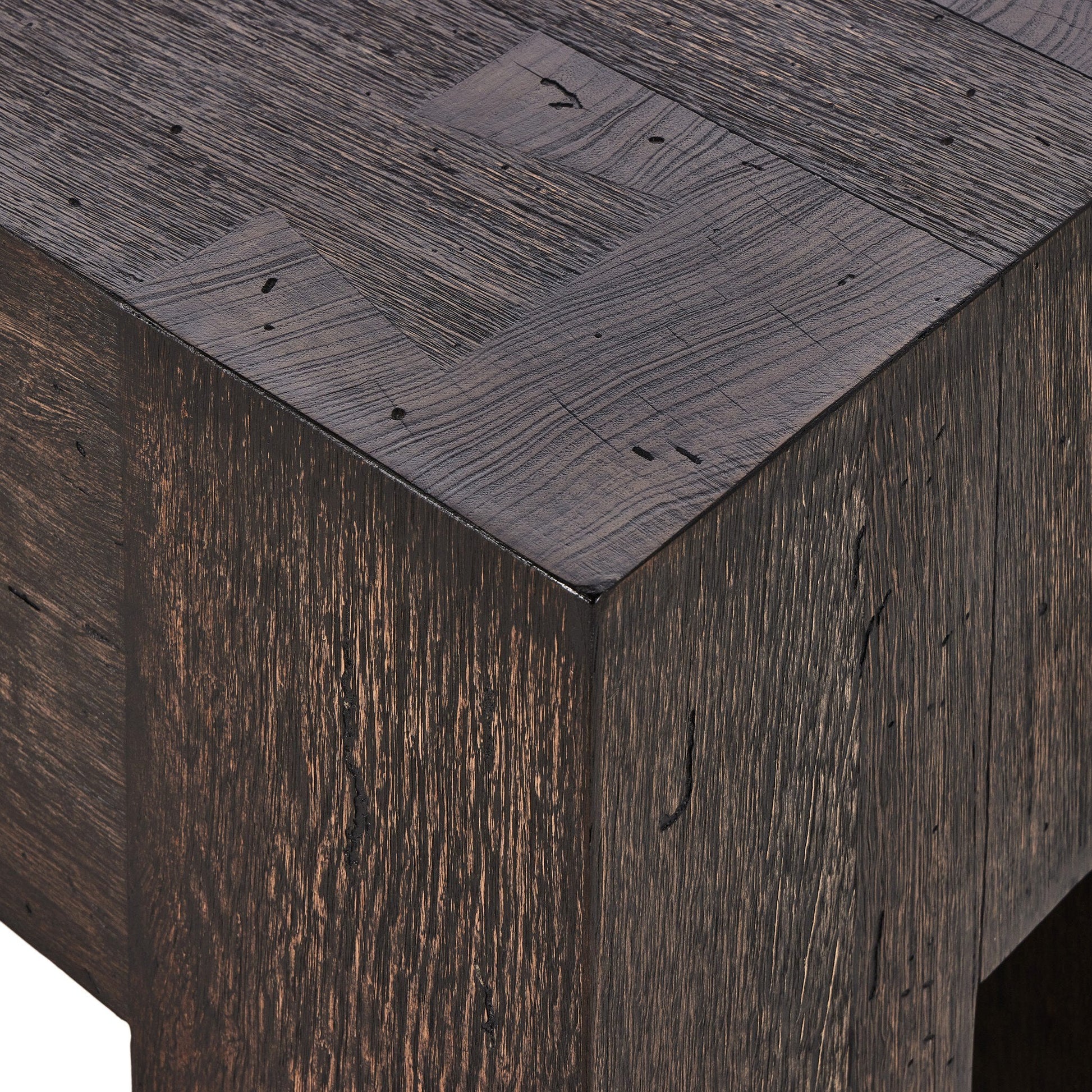 Fabriqué à partir de placage de chêne à coupe épaisse avec une finition rustique imitant le bois rongé par les vers. Doté de lignes épurées à la Parsons, de pieds carrés massifs et de détails de menuiserie à queue d'aronde.