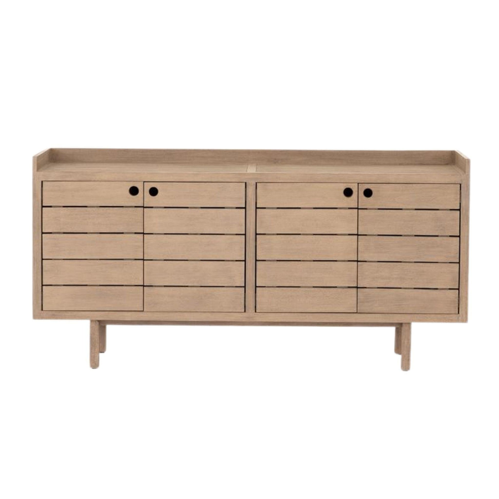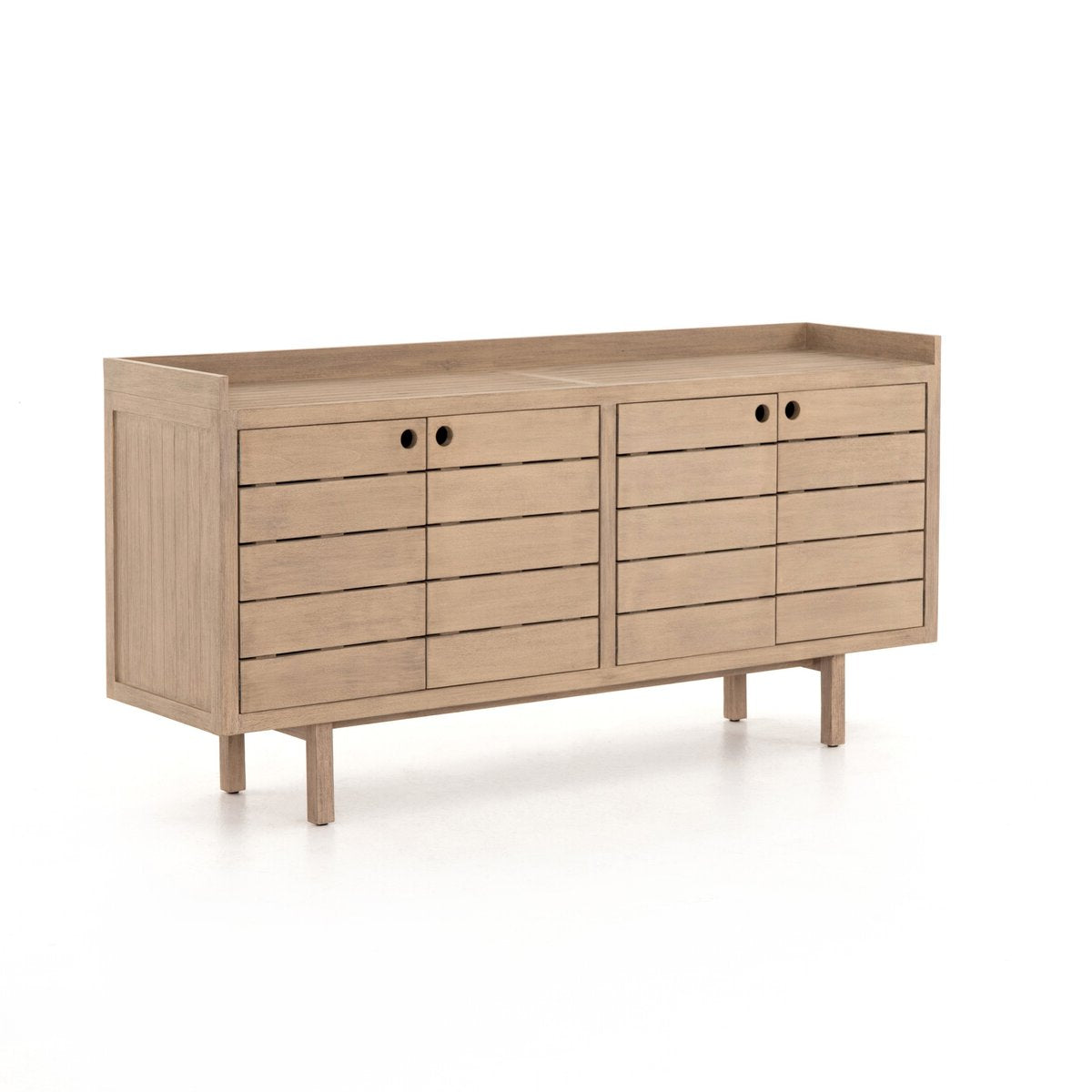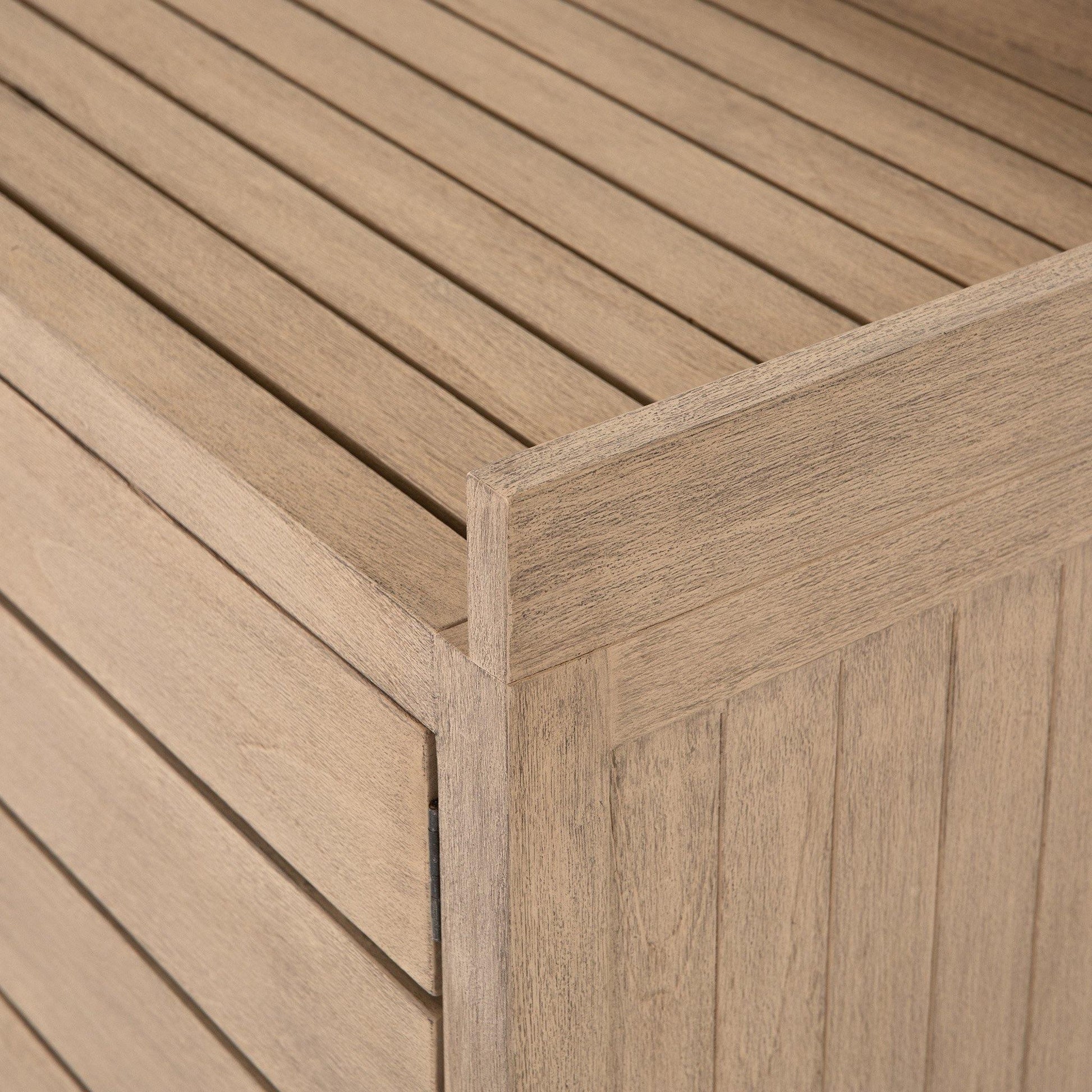Apportez style et rangement à votre espace extérieur avec le buffet extérieur Lili. La finition brun lavé de ce buffet en teck lui confère un aspect unique et texturé grâce à ses lattes, et l'absence de quincaillerie ajoute à son charme. Son plateau galéré offre un endroit idéal pour recevoir en plein air.