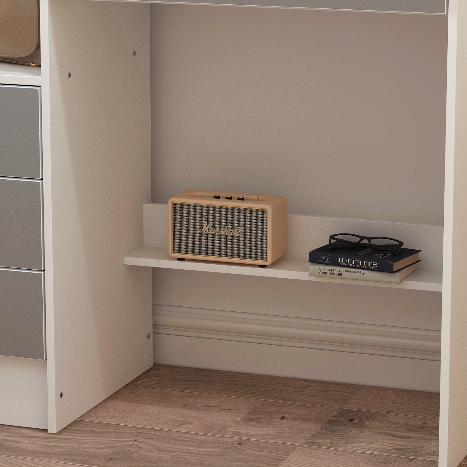Ce kit coiffeuse et tabouret est conçu avec des rangements pour cosmétiques. L'ensemble coiffeuse et tabouret est un meuble moderne, élégant et pratique pour votre intérieur. Le grand miroir de maquillage et les 4 tiroirs offrent un espace de rangement ample pour vos cosmétiques, parfums, lotions, vernis à ongles, accessoires pour cheveux, etc. Le tabouret rembourré est stable et confortable.