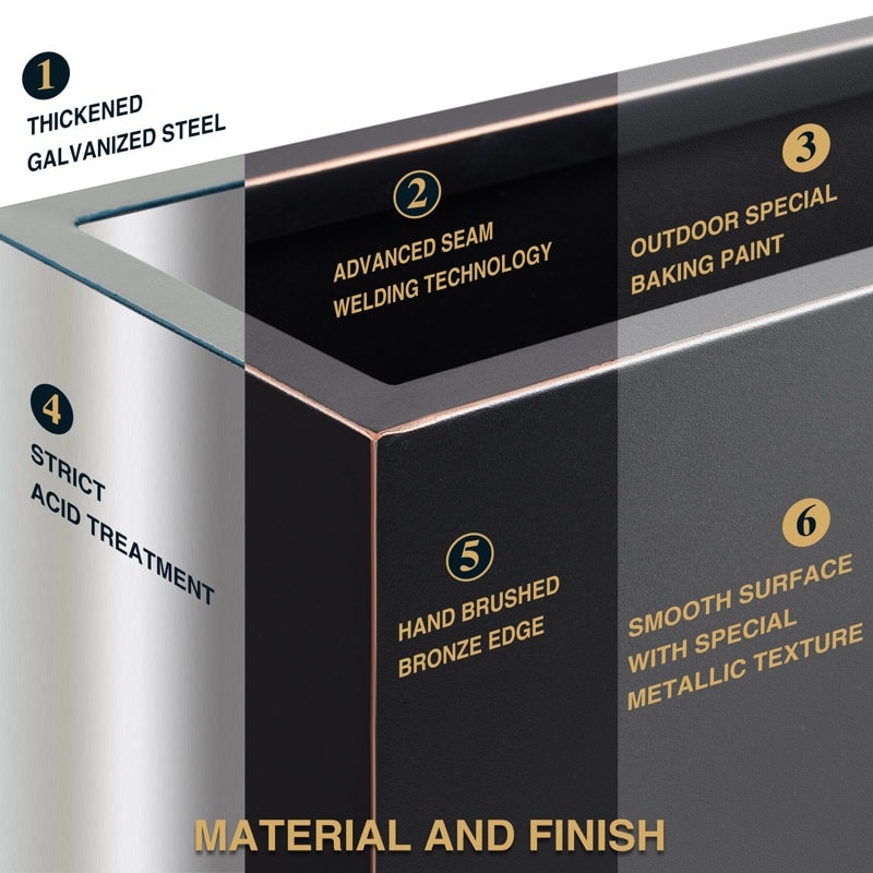 Que ce soit pour votre chambre, votre patio ou le mur d'entrée terne de votre maison, ce bac à plantes métallique pour intérieur/extérieur – avec son équilibre parfait entre design, durabilité et praticité – présente un design moderne et épuré qui rehaussera votre décoration extérieure ou vos environnements résidentiels et commerciaux à un niveau supérieur. Fabriqué en acier galvanisé épais, soudé et thermolaqué, avec une finition de qualité meuble, ce bac à plantes est flexible, résistant aux chocs, aux fissures et aux rayures. Pour couronner le tout, il est équipé d'un trou de drainage optionnel pour évacuer facilement l'excès d'eau.