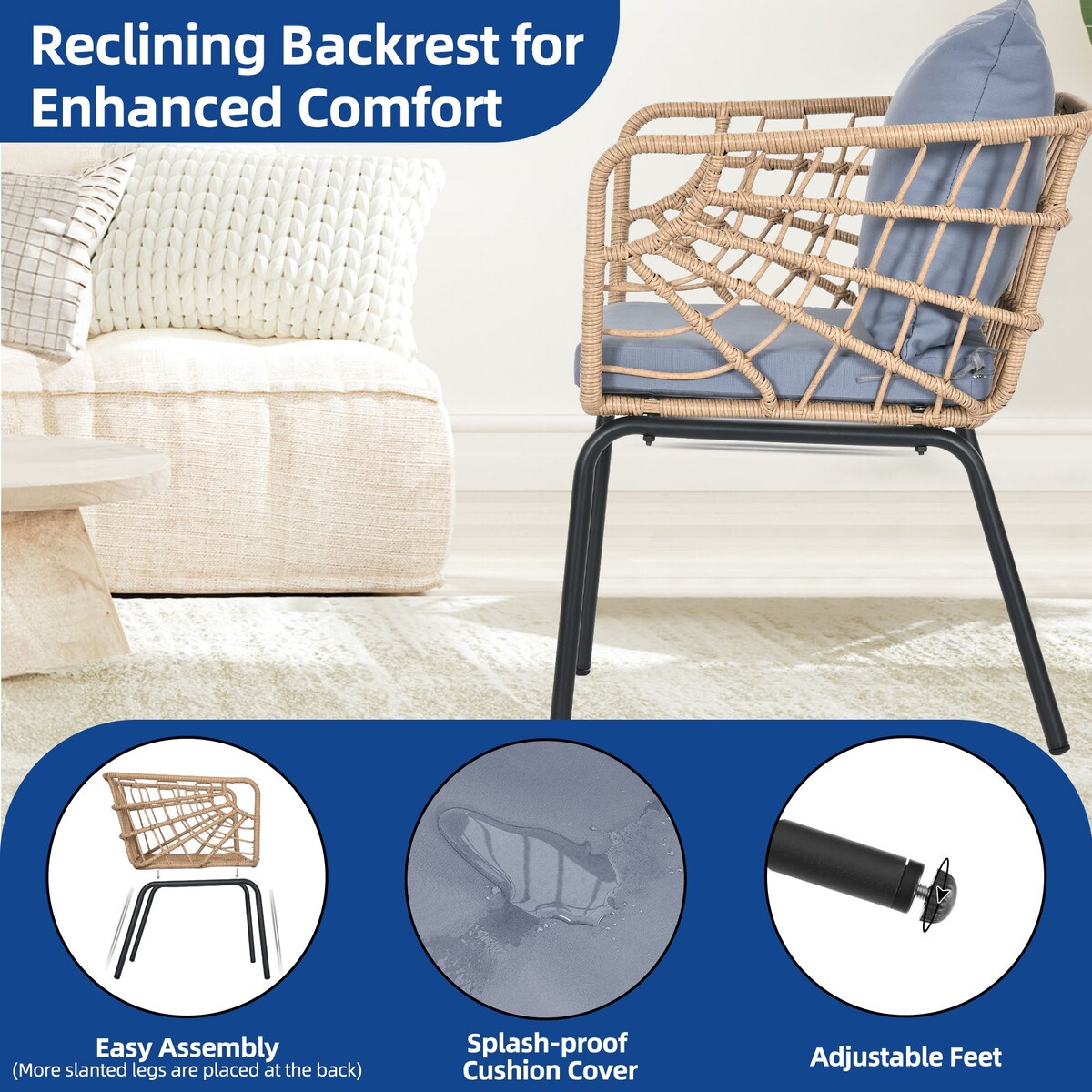 - Robuste et résistant aux intempéries : Fabriqué avec un cadre en métal et du rotin PE résistant à toutes les conditions météorologiques, garantissant stabilité et durabilité avec une capacité de poids de 259 lbs.