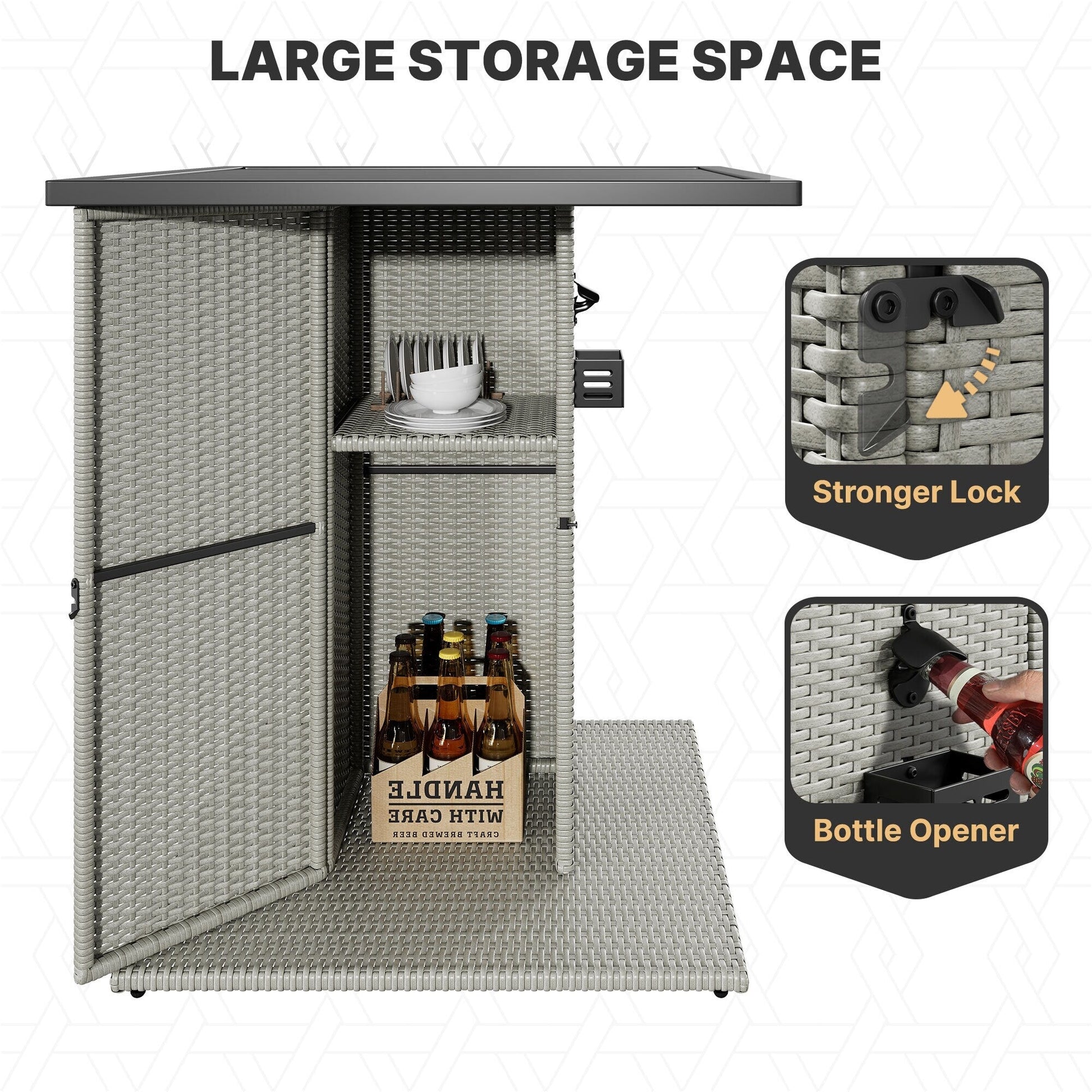 La table de bar est dotée d'un ouvre-bouteilles et d'un compartiment de rangement derrière une porte magnétique pour plus de commodité. Idéale pour recevoir vos invités lors de rassemblements informels, de repas ou de fêtes au bord de la piscine.