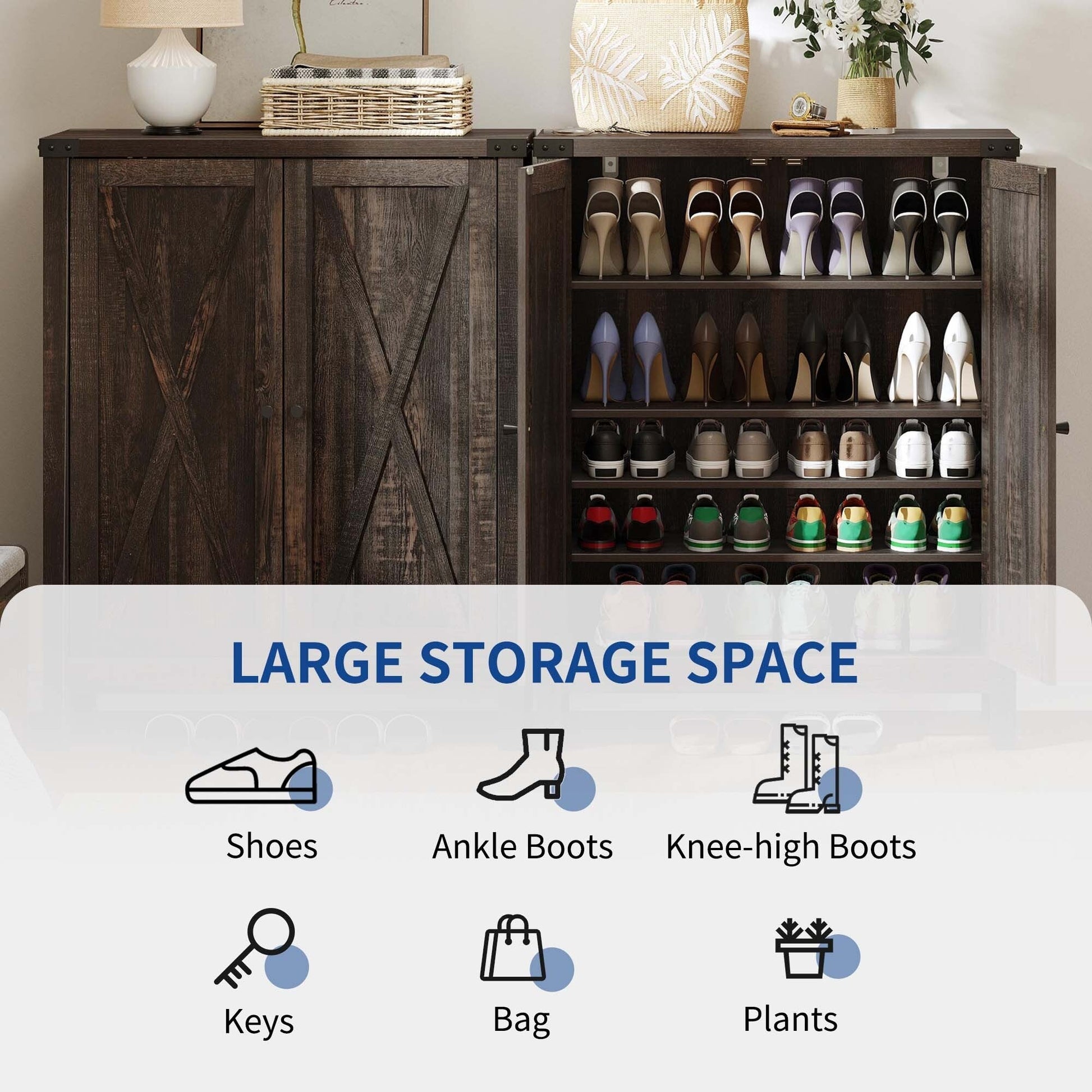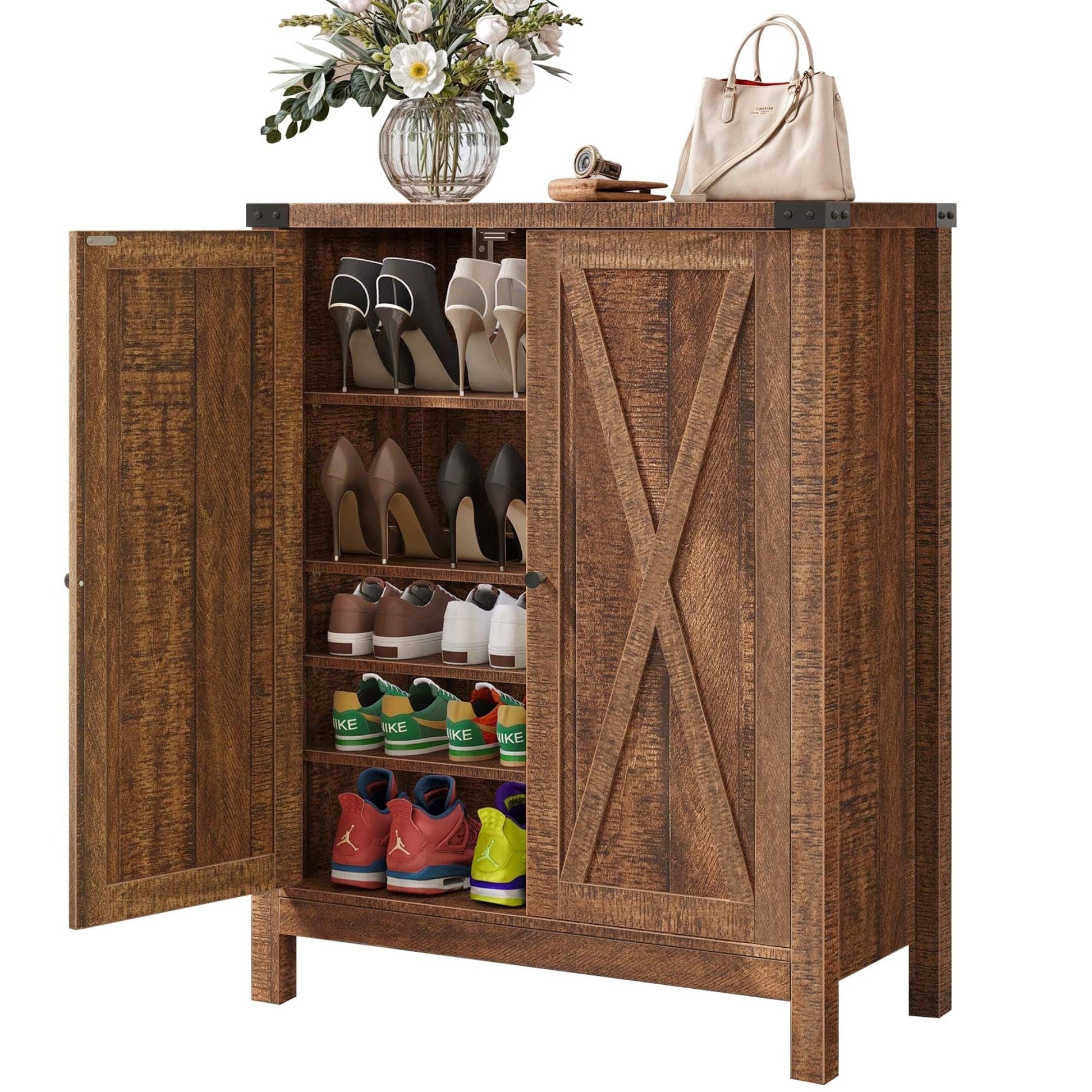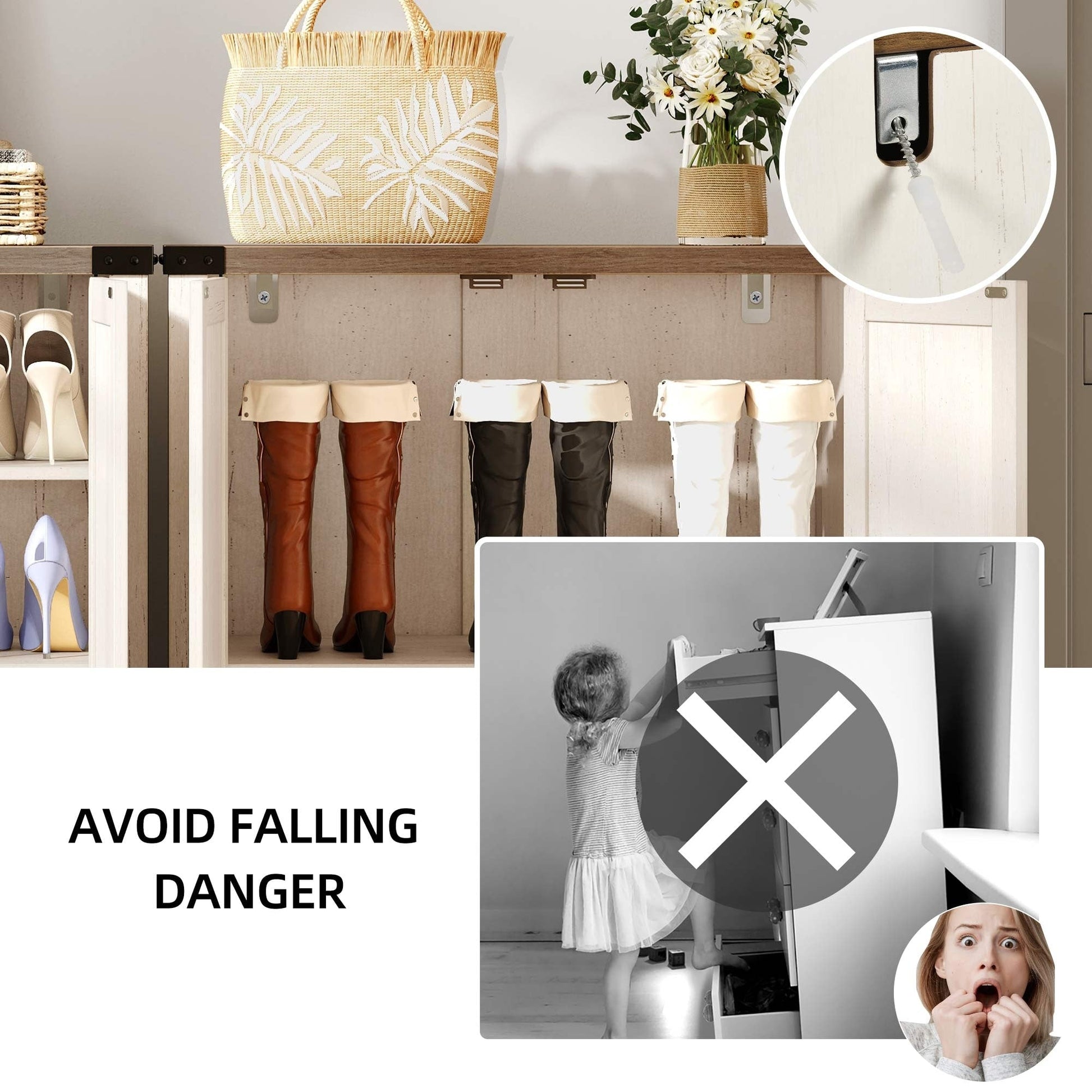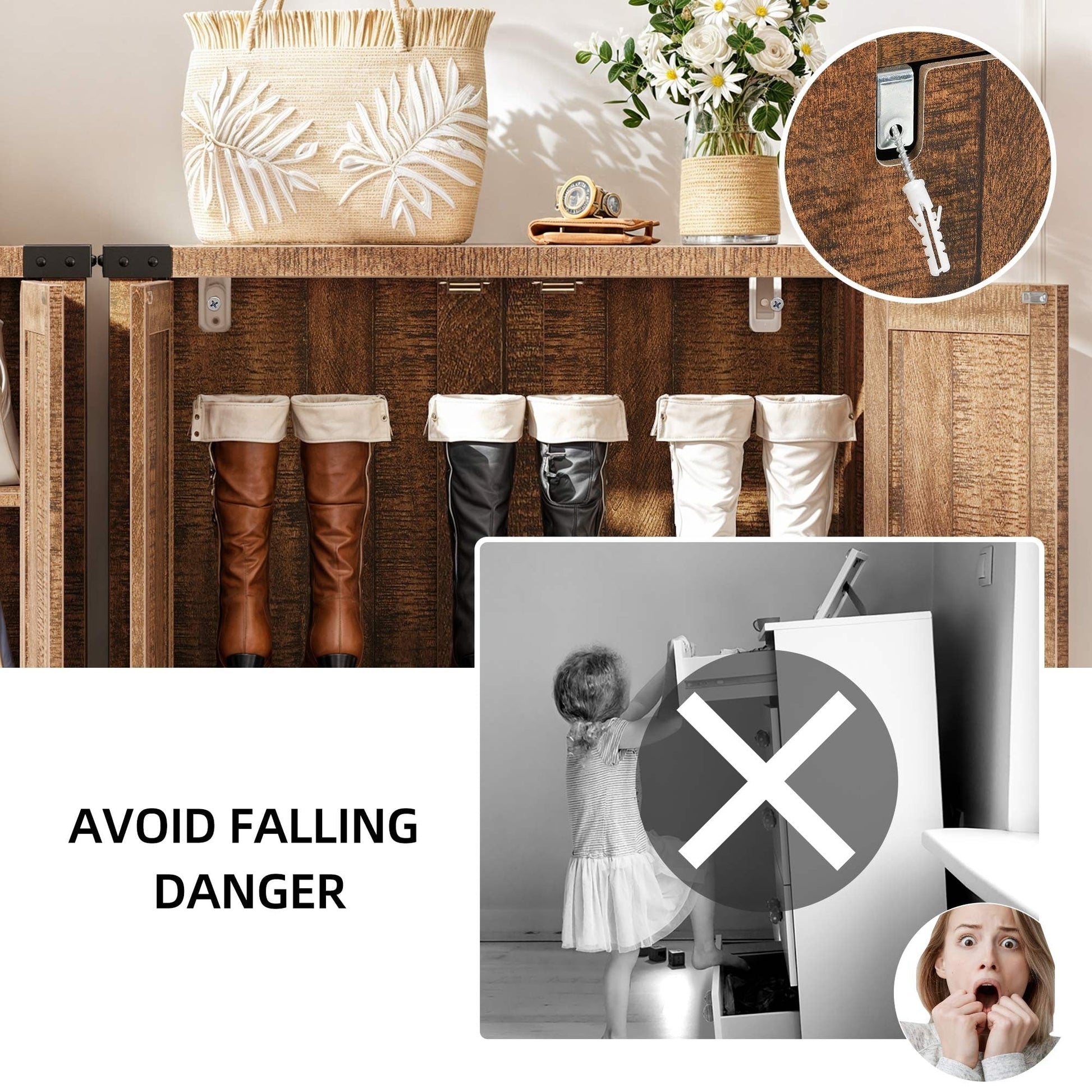 Organisez-vous avec notre grand meuble à chaussures. Avec 5 étagères pouvant accueillir 15 à 20 paires de chaussures, et un dessus pratique pour les petits objets, c'est un indispensable pour toute maison. Le motif X exquis du meuble ajoute une touche de charme campagnard, tandis que les 1ère et 3ème étagères réglables s'adaptent à tous types de chaussures. Fabriqué en MDF durable avec des pieds en bois robustes, il est conçu pour la stabilité et la longévité. N'oubliez pas d'installer le kit anti-basculement fourni pour plus de sécurité.