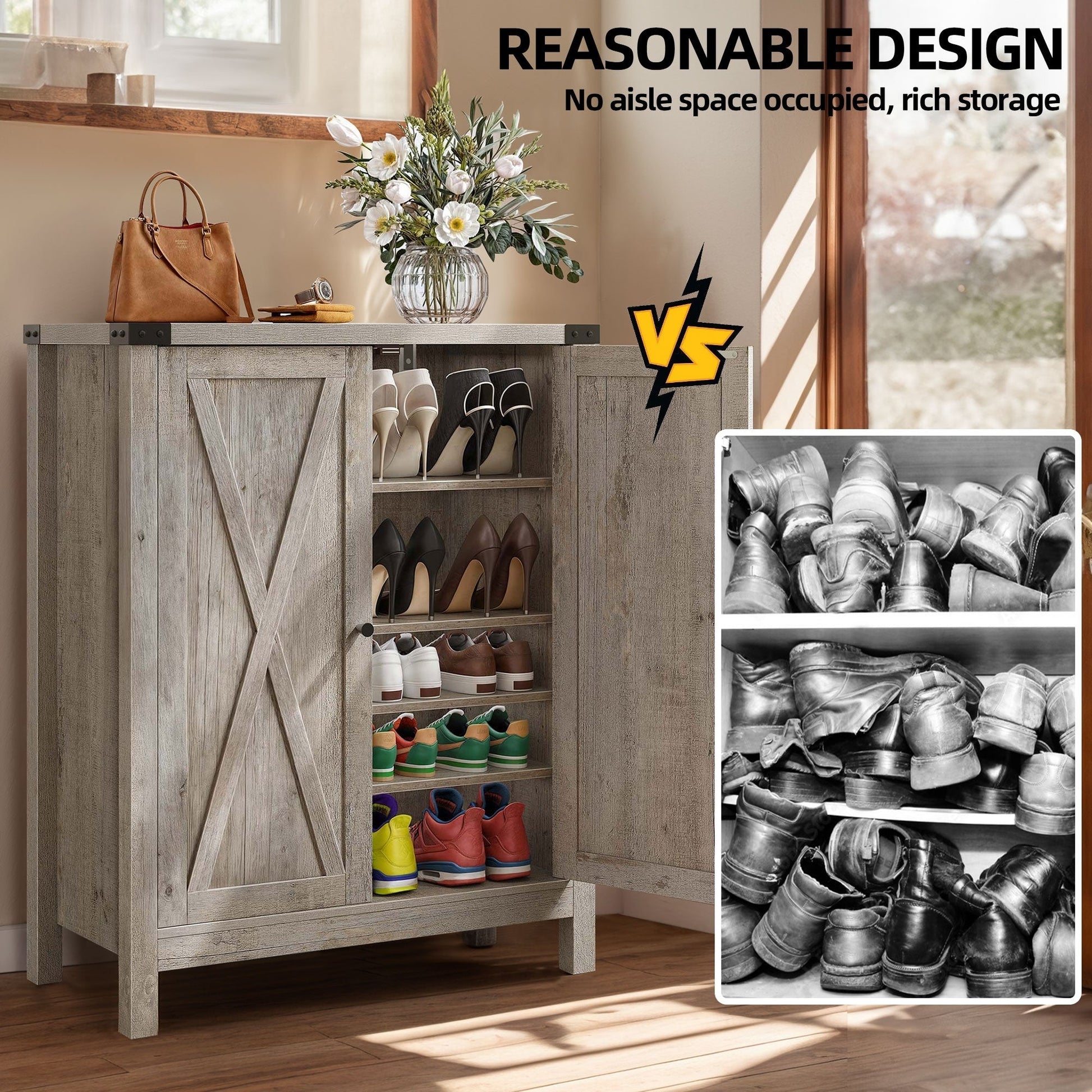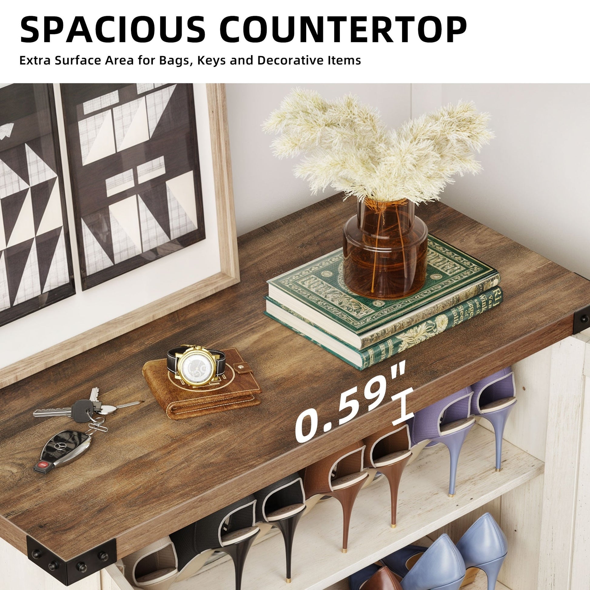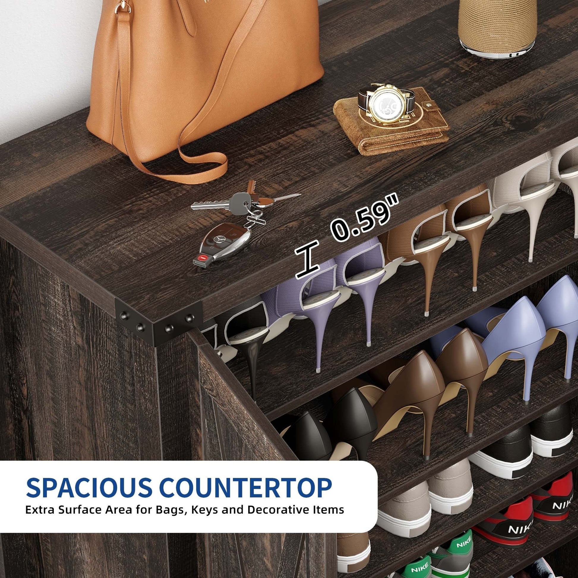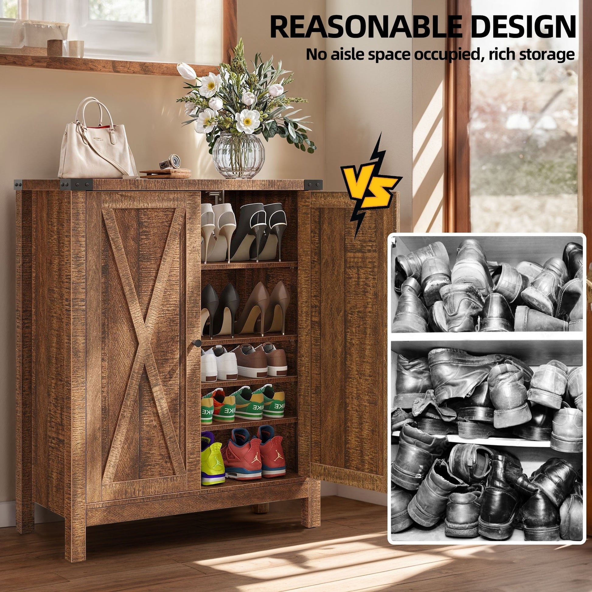 Organisez-vous avec notre grand meuble à chaussures. Avec 5 étagères pouvant accueillir 15 à 20 paires de chaussures, et un dessus pratique pour les petits objets, c'est un indispensable pour toute maison. Le motif X exquis du meuble ajoute une touche de charme campagnard, tandis que les 1ère et 3ème étagères réglables s'adaptent à tous types de chaussures. Fabriqué en MDF durable avec des pieds en bois robustes, il est conçu pour la stabilité et la longévité. N'oubliez pas d'installer le kit anti-basculement fourni pour plus de sécurité.