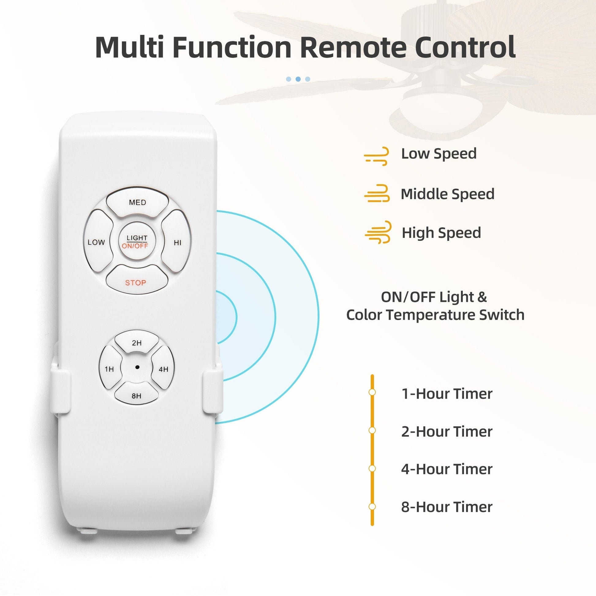 Ce charmant ventilateur de plafond tropical avec éclairage présente un design d'île tropicale, fabriqué avec cinq pales en forme de feuille de palmier, ajoutant forme et fonctionnalité à votre espace intérieur. Il est robuste, léger et aérodynamique, assurant un aspect neuf pendant de nombreuses années. Le ventilateur possède un design intégré et est parfait pour les pièces de taille moyenne de moins de 350 pieds carrés.
