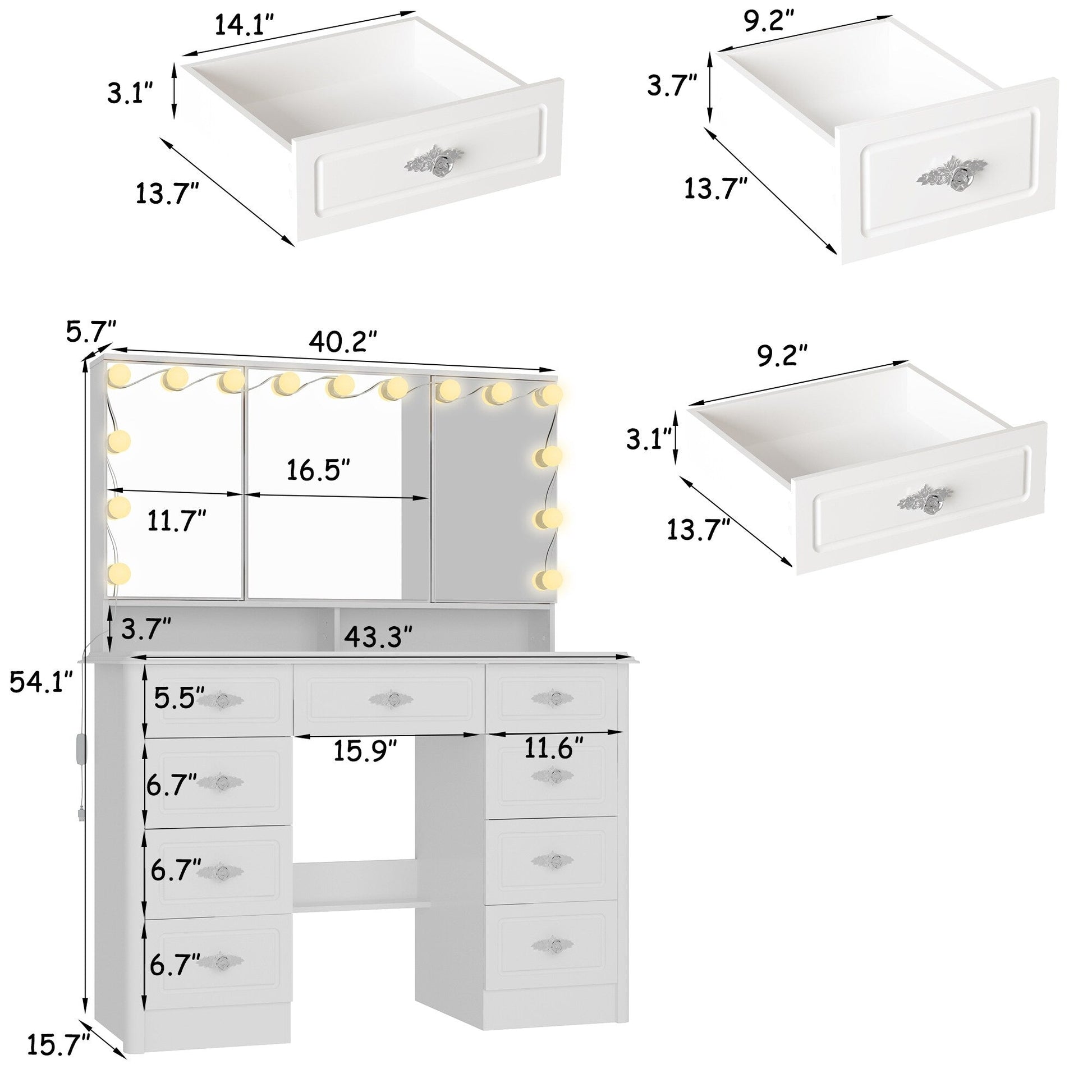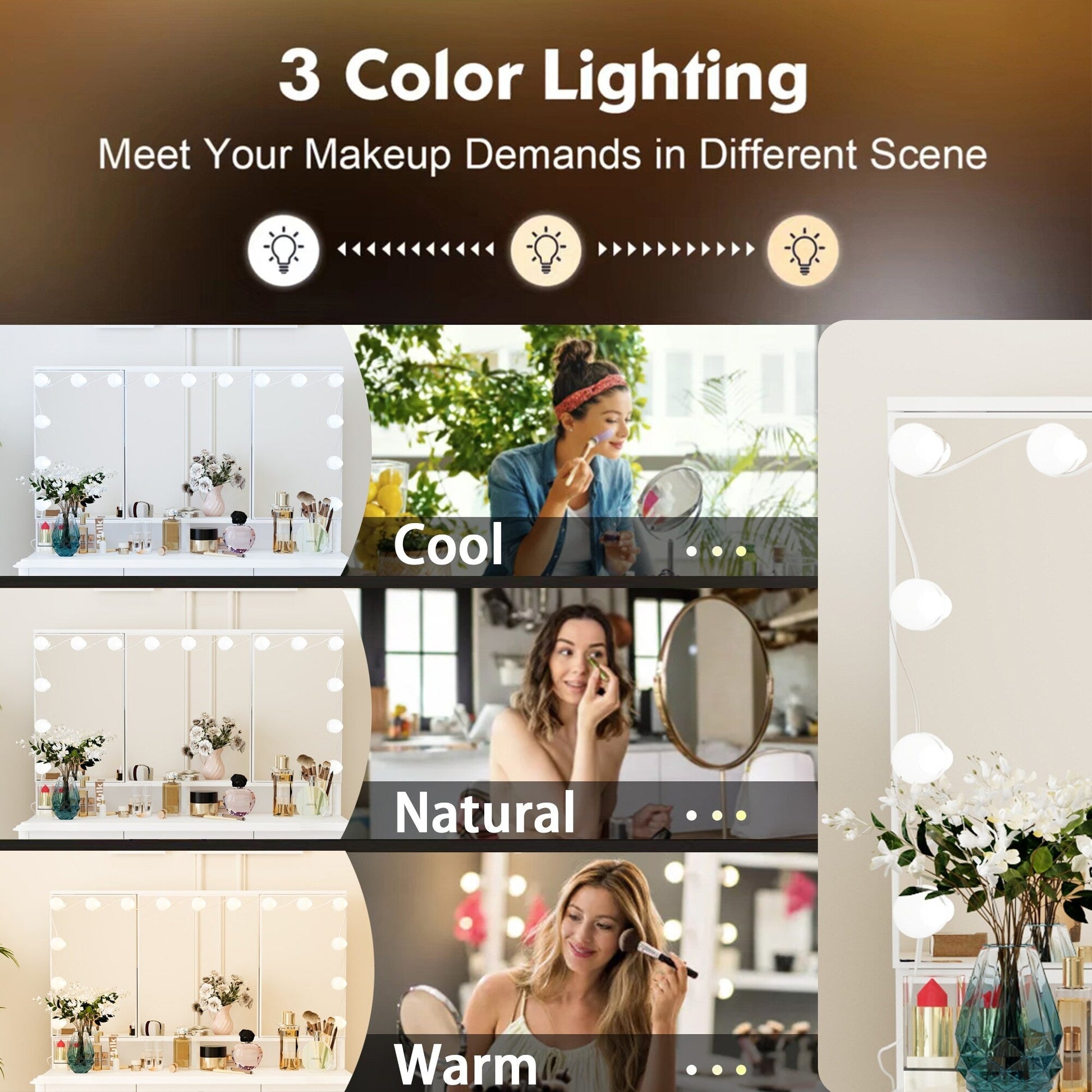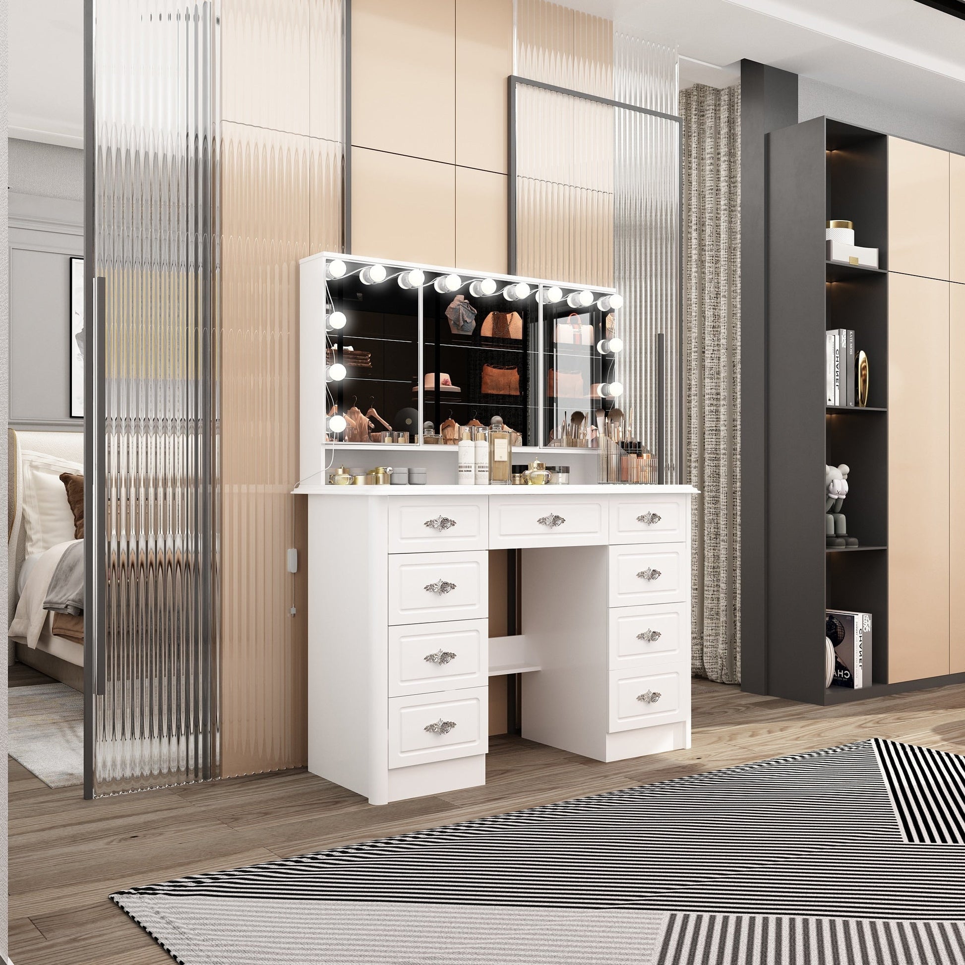 Coiffeuse élégante blanche avec miroir à trois volets et éclairage réglable