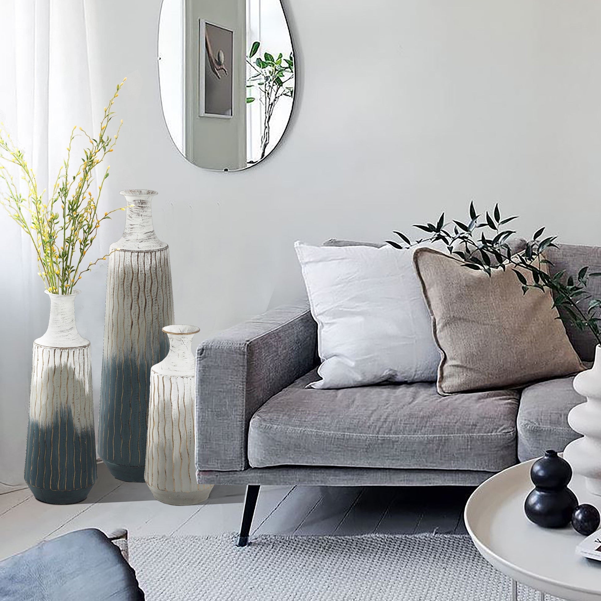 Ajoutez une touche d'élégance moderne à votre décoration avec cet ensemble de trois vases-bouteilles en métal faits à la main. Présentant un magnifique design délavé bleu, gris et blanc avec des reflets dorés, ces vases feront sensation dans n'importe quelle pièce. La forme effilée et l'embouchure cannelée de chaque vase ajoutent une touche unique à votre arrangement au sol ou sur une table. Ces vases sont parfaits pour exposer des fleurs séchées ou artificielles et sont disponibles en trois tailles différentes pour un look complet. Que vous les regroupiez ou les placiez séparément, ces vases ajouteront certainement de la profondeur et de la hauteur à votre décoration.