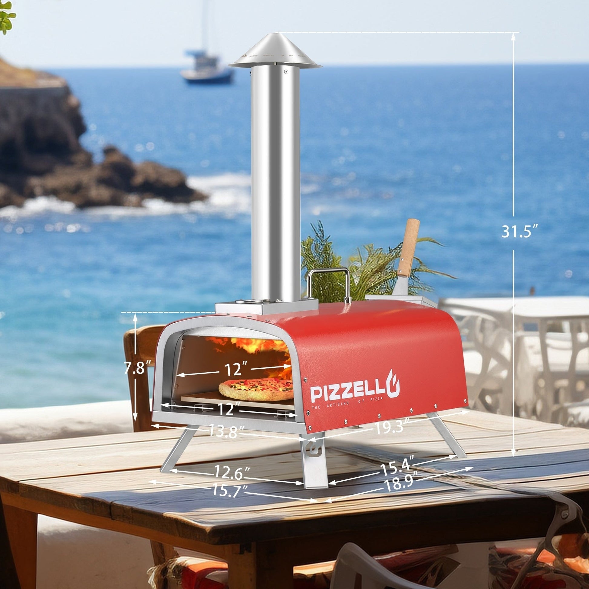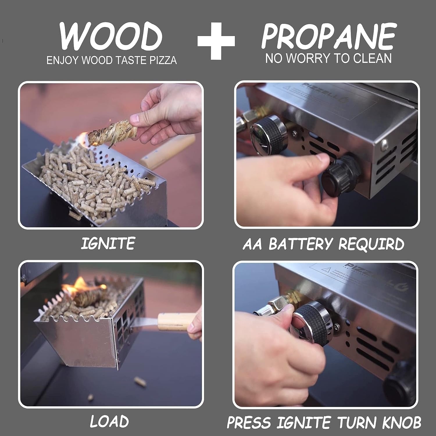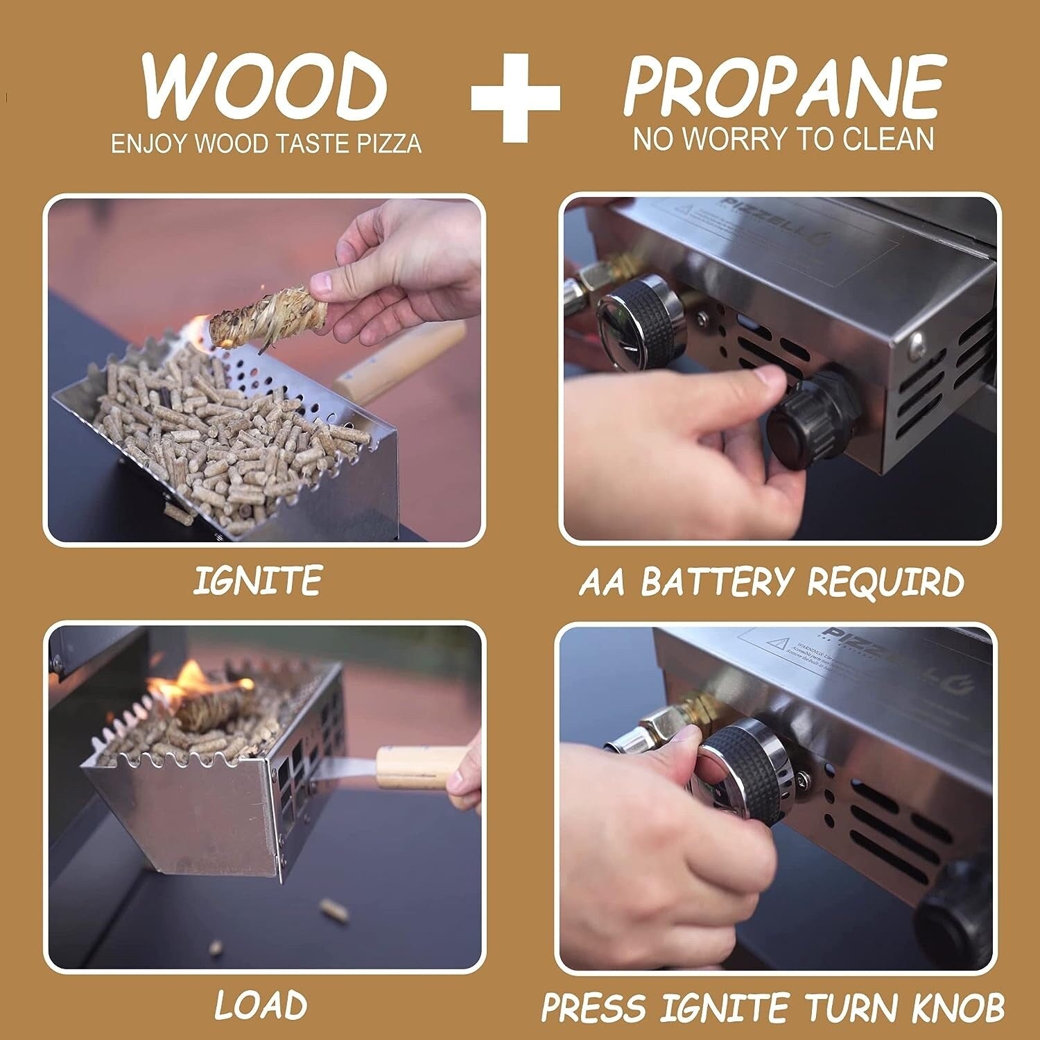 Notre four à pizza extérieur de 12 pieds est équipé de brûleurs à double combustible (propane et bois), atteint 752℉ en seulement 25 à 30 minutes et cuit les pizzas en 60 secondes. Ce four à pizza portable est idéal pour les fêtes et le camping grâce à ses pieds pliables et son conduit de fumée amovible. Ce four à pizza à double combustible comprend un brûleur à gaz, une pelle à pizza, une pierre, un plateau en bois et un sac de transport. Cet excellent four à pizza à gaz est un excellent cadeau pour Noël et autres fêtes.