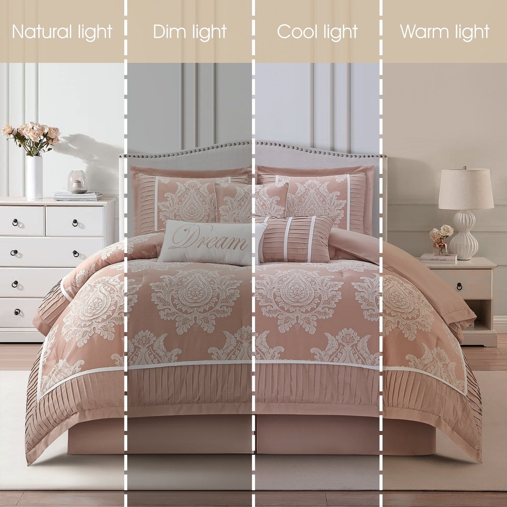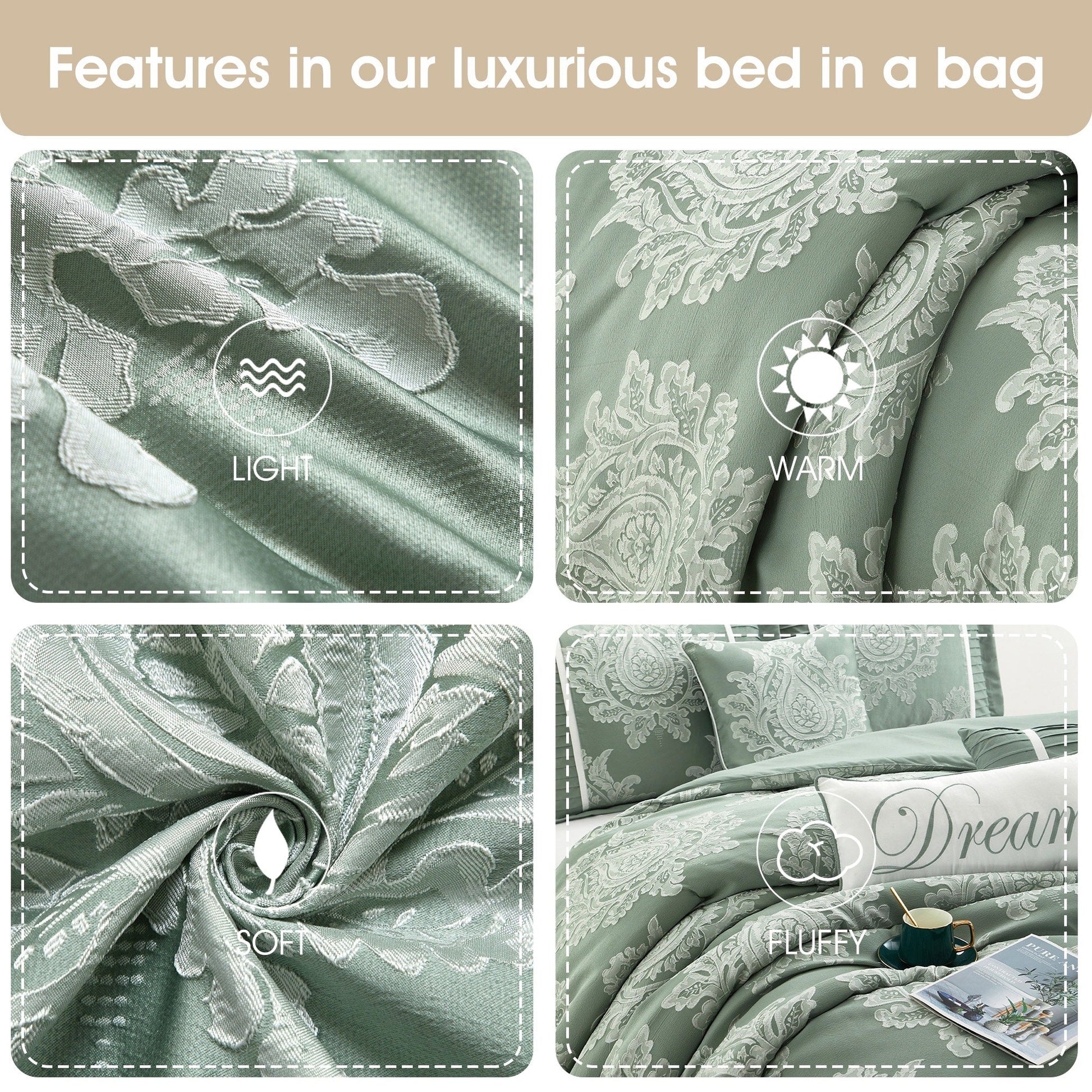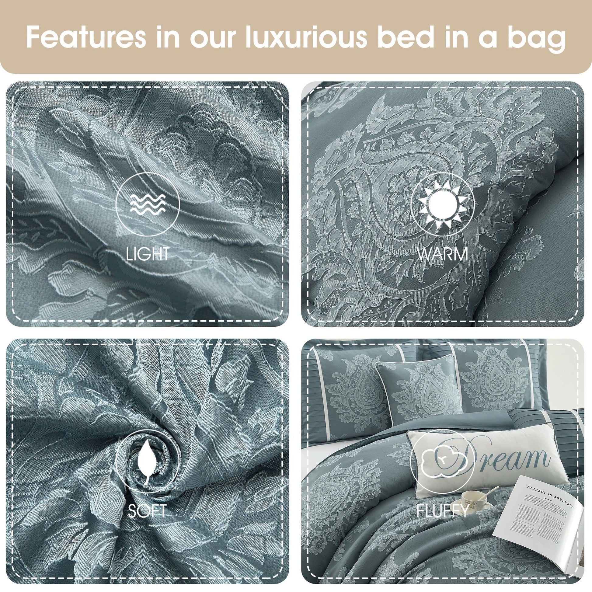 Apportez une touche d'élégance intemporelle à votre chambre à coucher avec notre luxueux ensemble de couette 7 pièces. La couette et les taies d'oreiller exquises arborent fièrement un magnifique motif de médaillon jacquard avec un bord plissé, créant un effet visuellement saisissant et multidimensionnel. Conçu à partir de tissu jacquard texturé, cet ensemble ajoute une touche de sophistication et de charme à n'importe quel style de décoration. Léger et parfait pour toutes les saisons, il rehausse l'ambiance générale de votre espace grâce à ses détails complexes et son design classique.