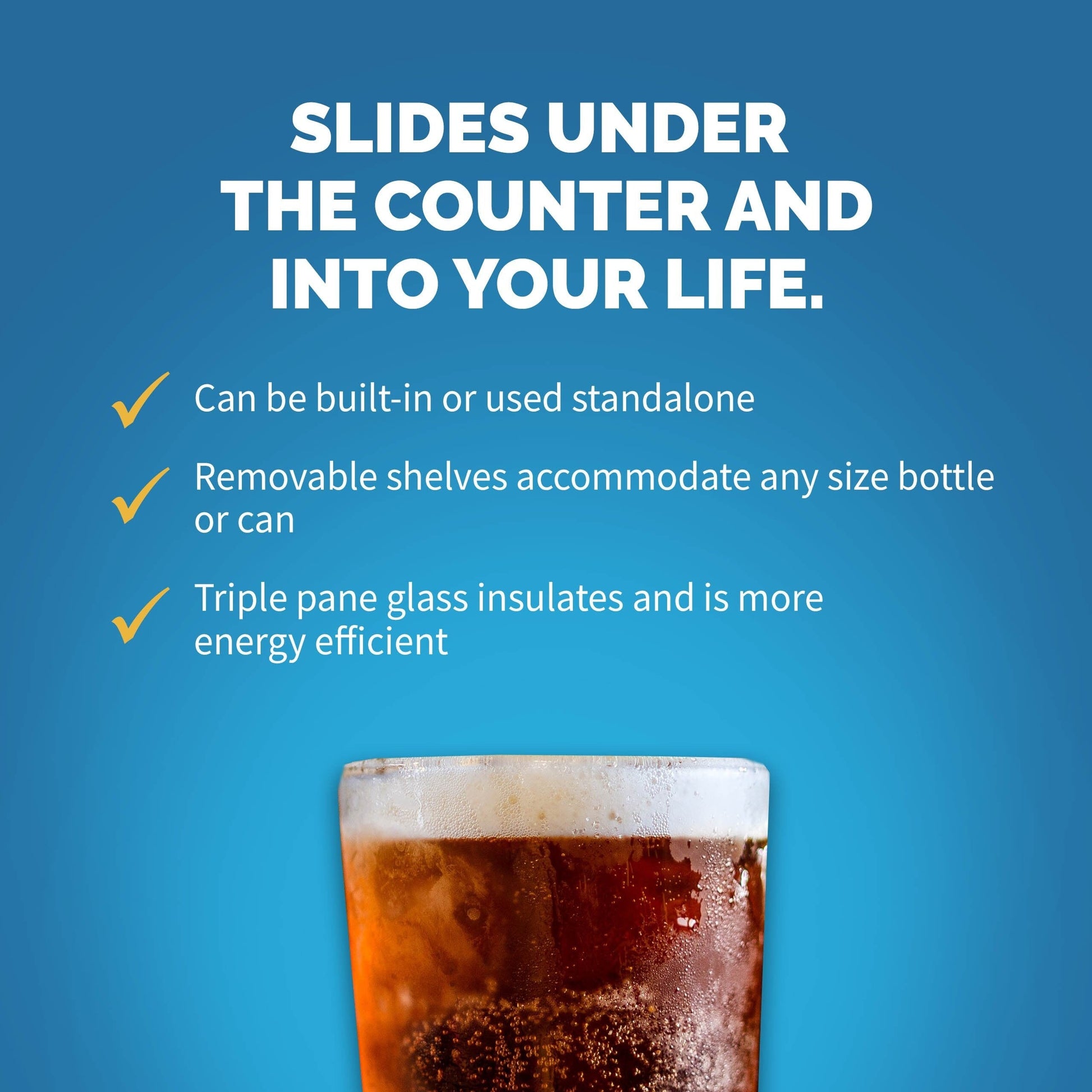 Le système de compresseur silencieux à évacuation frontale permet à ce réfrigérateur à boissons spacieux de s'intégrer facilement sous les comptoirs de cuisine standard. Il suffit de le glisser en place pour un aspect épuré et intégré qui s'harmonise parfaitement avec vos armoires, ou de le laisser se tenir seul. À vous de choisir.