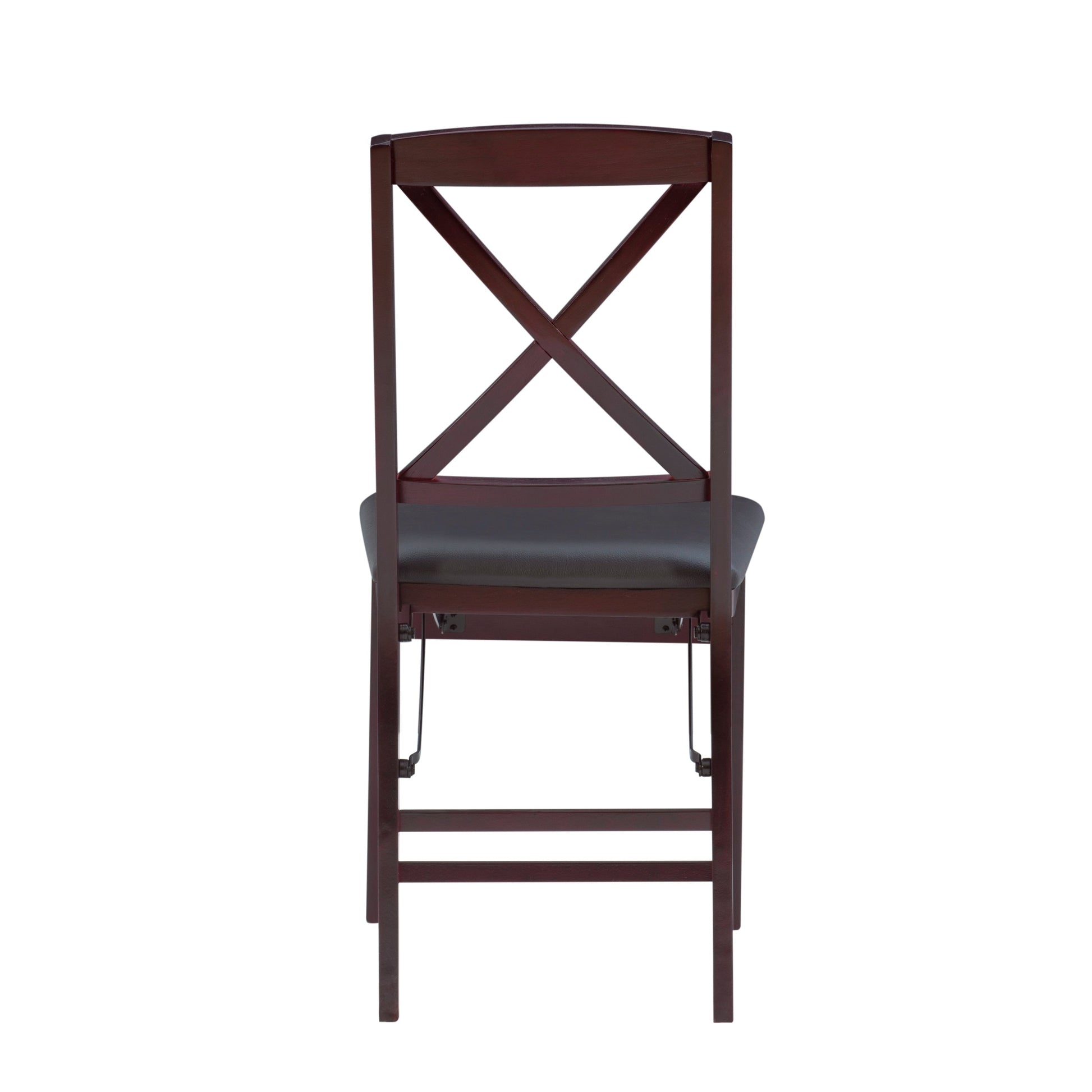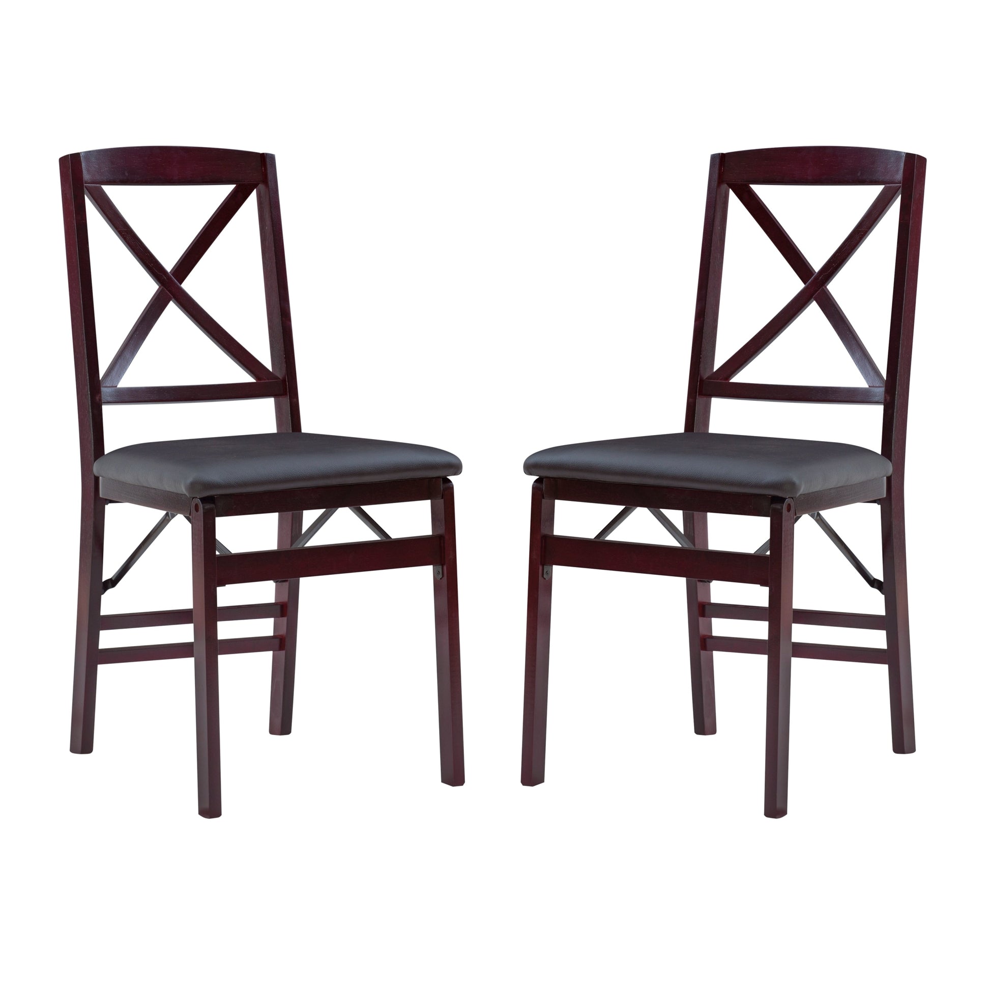 Des assises élégantes avec le côté pratique d'une chaise pliante. Ce lot de deux chaises pliantes ajoute une touche d'élégance supplémentaire pour les repas ou les réceptions. Les cadres en bois présentent un dossier classique en X et un siège rembourré en simili cuir facile à nettoyer, avec l'aspect du cuir, et une riche finition merlot. Des supports avant et arrière offrent une stabilité supplémentaire. Les chaises, qui permettent de gagner de l'espace, se plient pour un rangement et une installation faciles. Aucun assemblage requis.