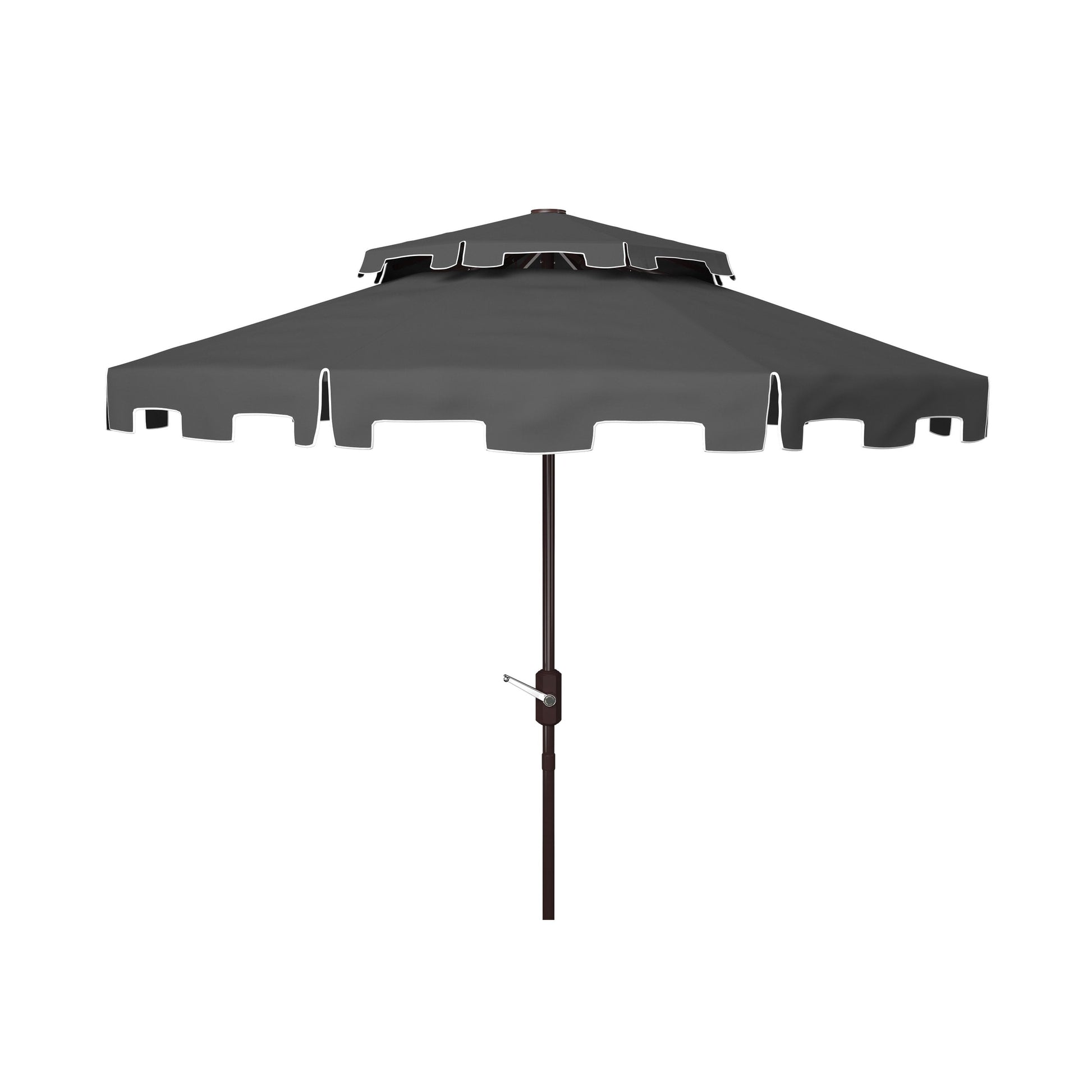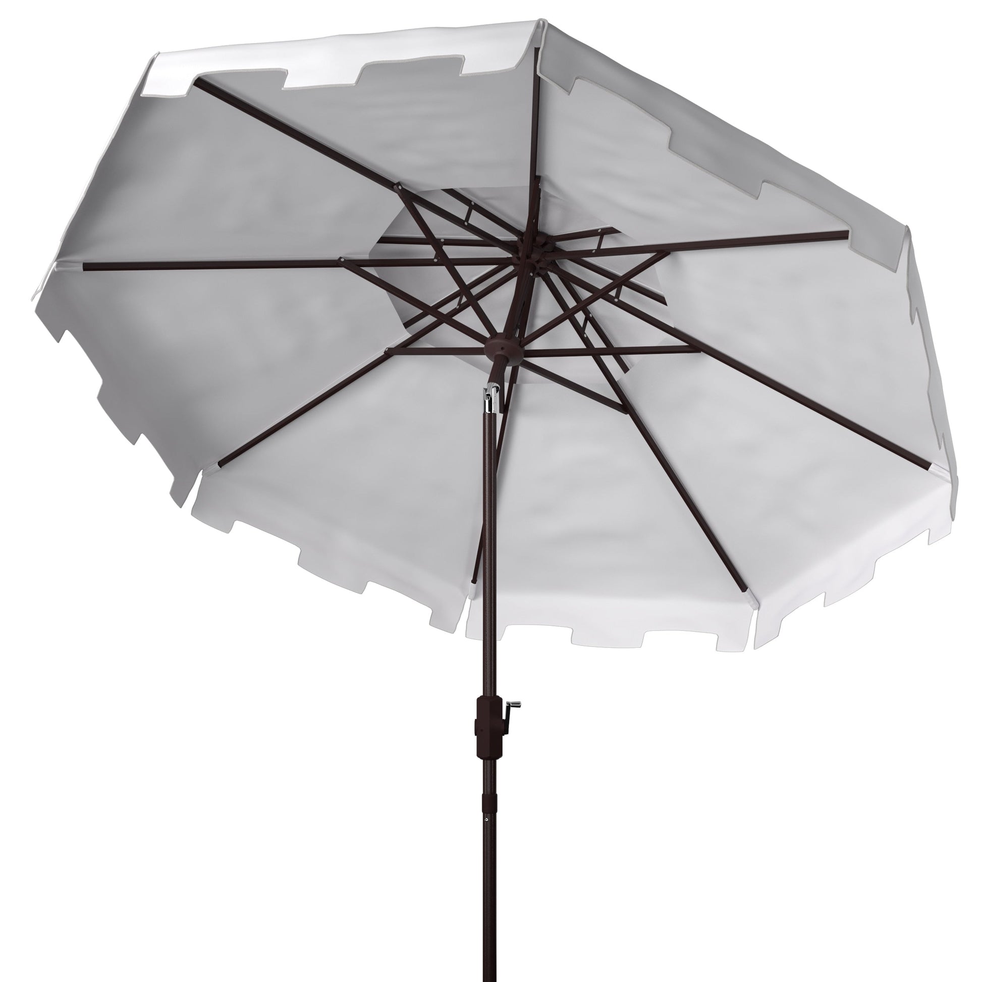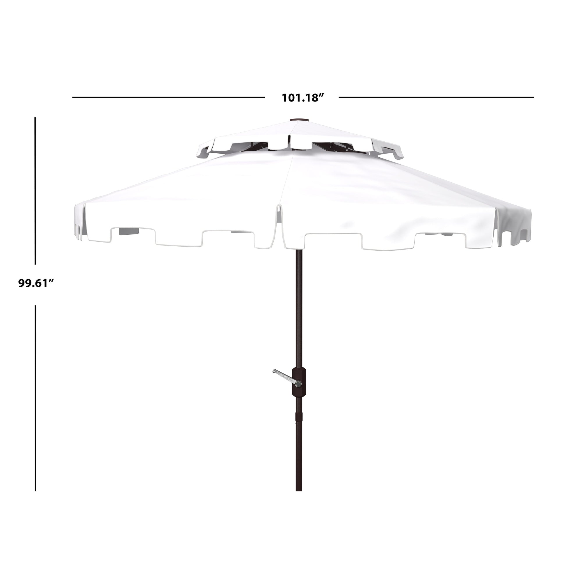 Un parasol de marché classique se pare d'un look élégant dans des tons côtiers frais et blancs, avec une double toiture pour une touche européenne chic. Son auvent en polyester de neuf pieds et son pied en aluminium brun en font un choix idéal pour la véranda ou la terrasse de la piscine. Comprend un mécanisme d'inclinaison et de rotation facile.