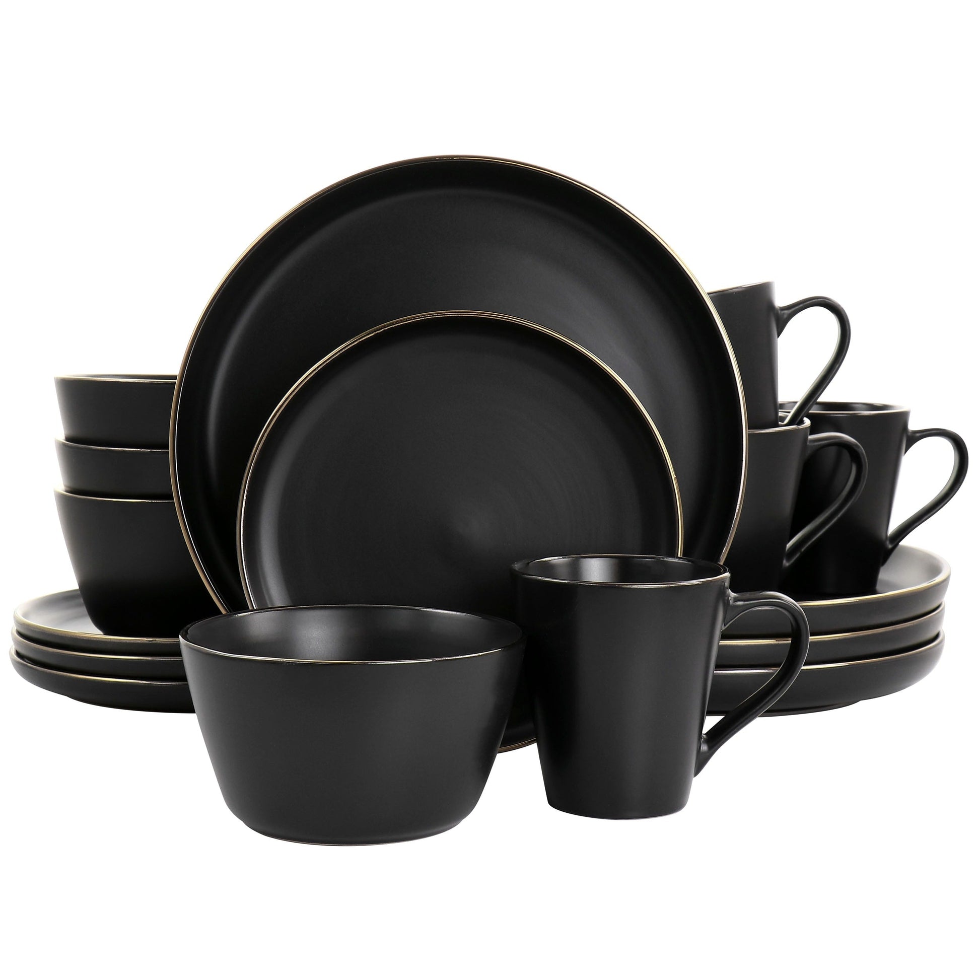 Add a beautiful accent to your dining table with this 16 Piece Round Stoneware Dinnerware Set in sophisticated Matte Black with Gold Rim Trim. Each dish is creatively crafted with a unique flat base, raised rim and trimmed in gold. Beautifully finished off with an thin, elegant gold rim this set is a statement piece. Constructed of Stoneware, this set is ideal for special occasion gatherings and sturdy for every day use. Each plate is microwave safe for quick reheating and dishwasher safe for easy cleaning.