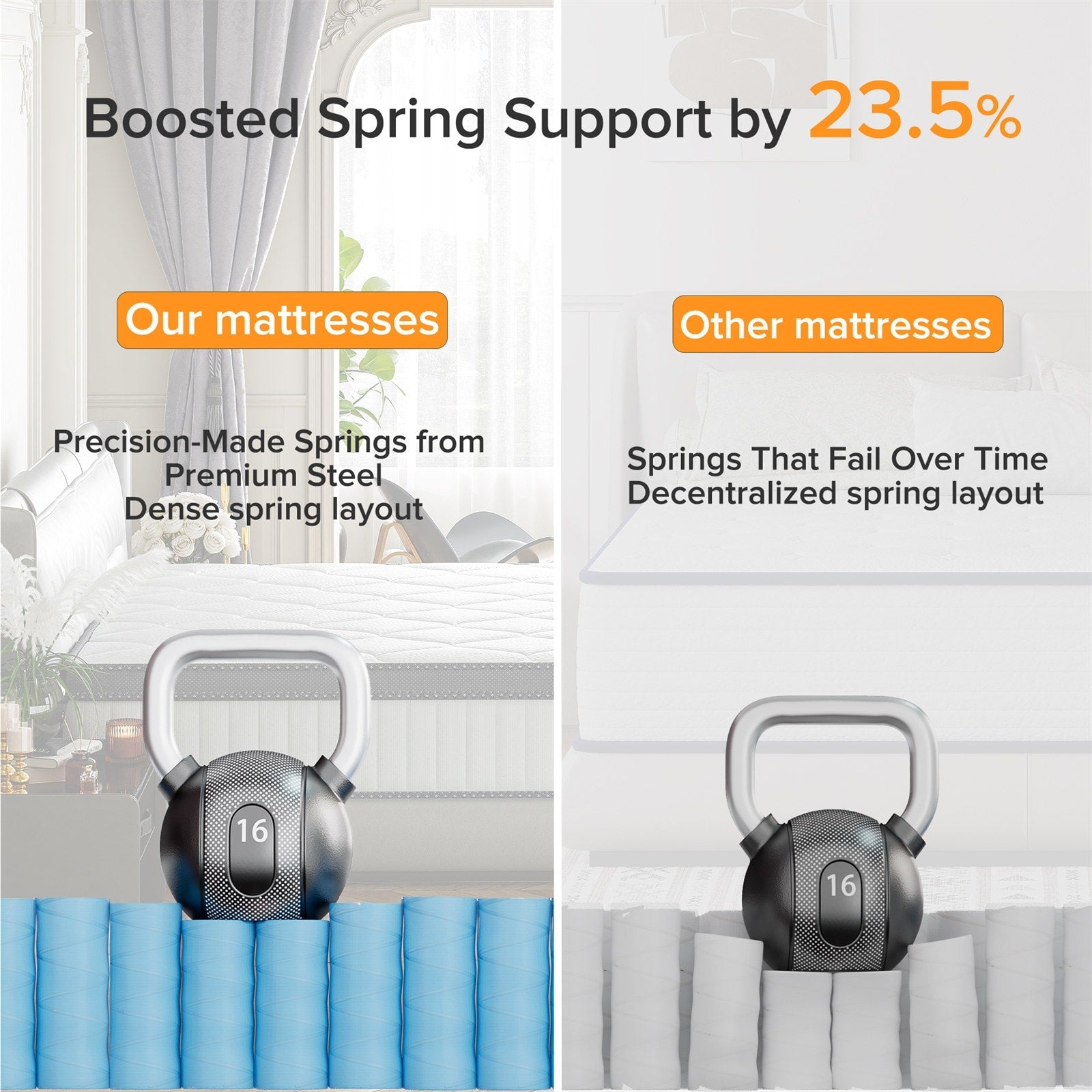 • Ressorts hélicoïdaux 23,5 % plus épais que la norme du marché : offrent un meilleur soutien, une durée de vie plus longue et empêchent l'effondrement.