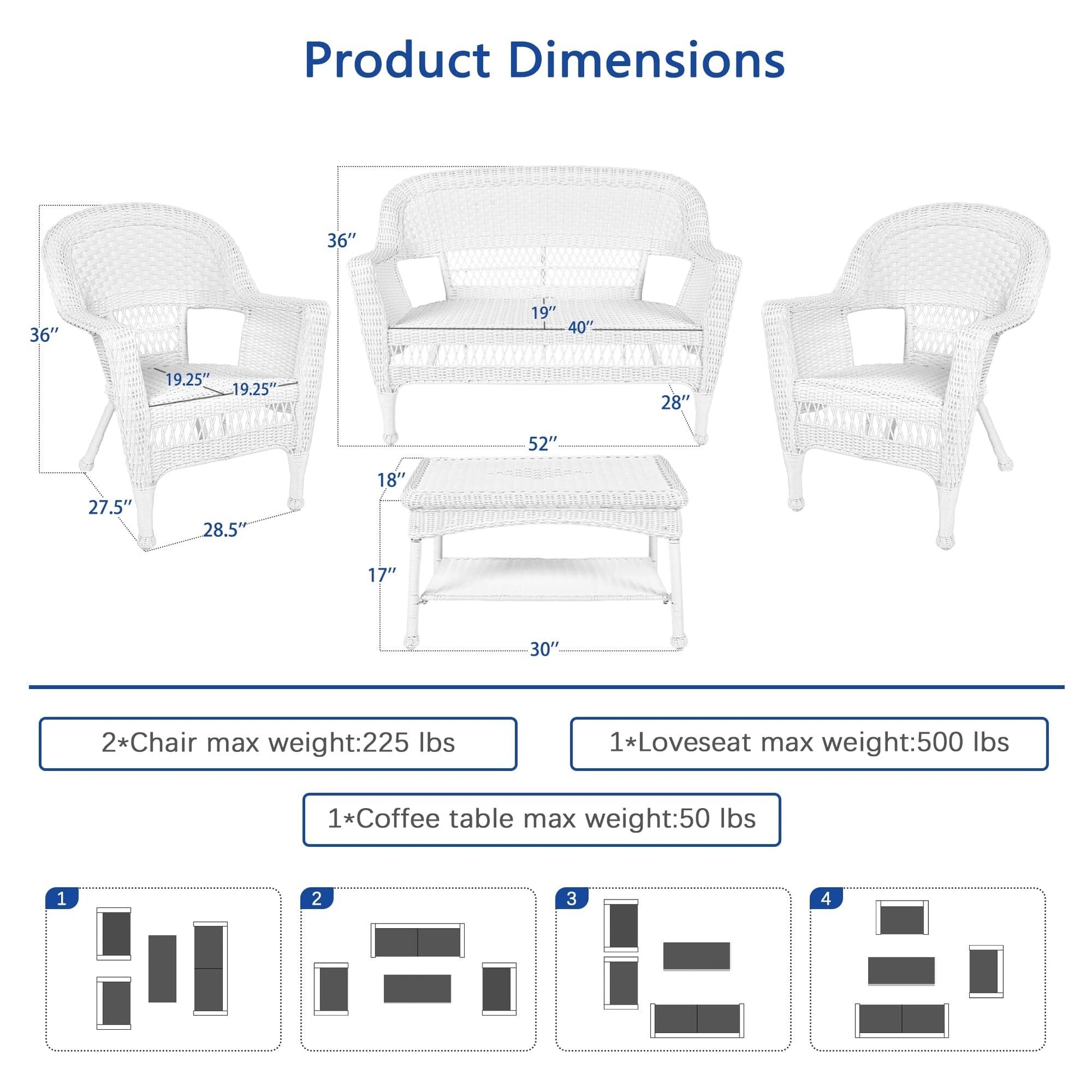 Détendez-vous avec style et confort grâce à cet exquis ensemble de jardin en osier 4 pièces qui transformera votre espace de vie extérieur. Fabriqué avec du rotin synthétique de haute qualité, résistant aux intempéries, et un cadre en acier robuste, cet ensemble est conçu pour résister à diverses conditions météorologiques et est parfait pour une utilisation intérieure et extérieure. Le design traditionnel en osier blanc ajoute une touche d'élégance à votre patio ou votre jardin, tandis que le canapé confortable, deux chaises et la table basse offrent amplement de place assise pour vous et vos invités.