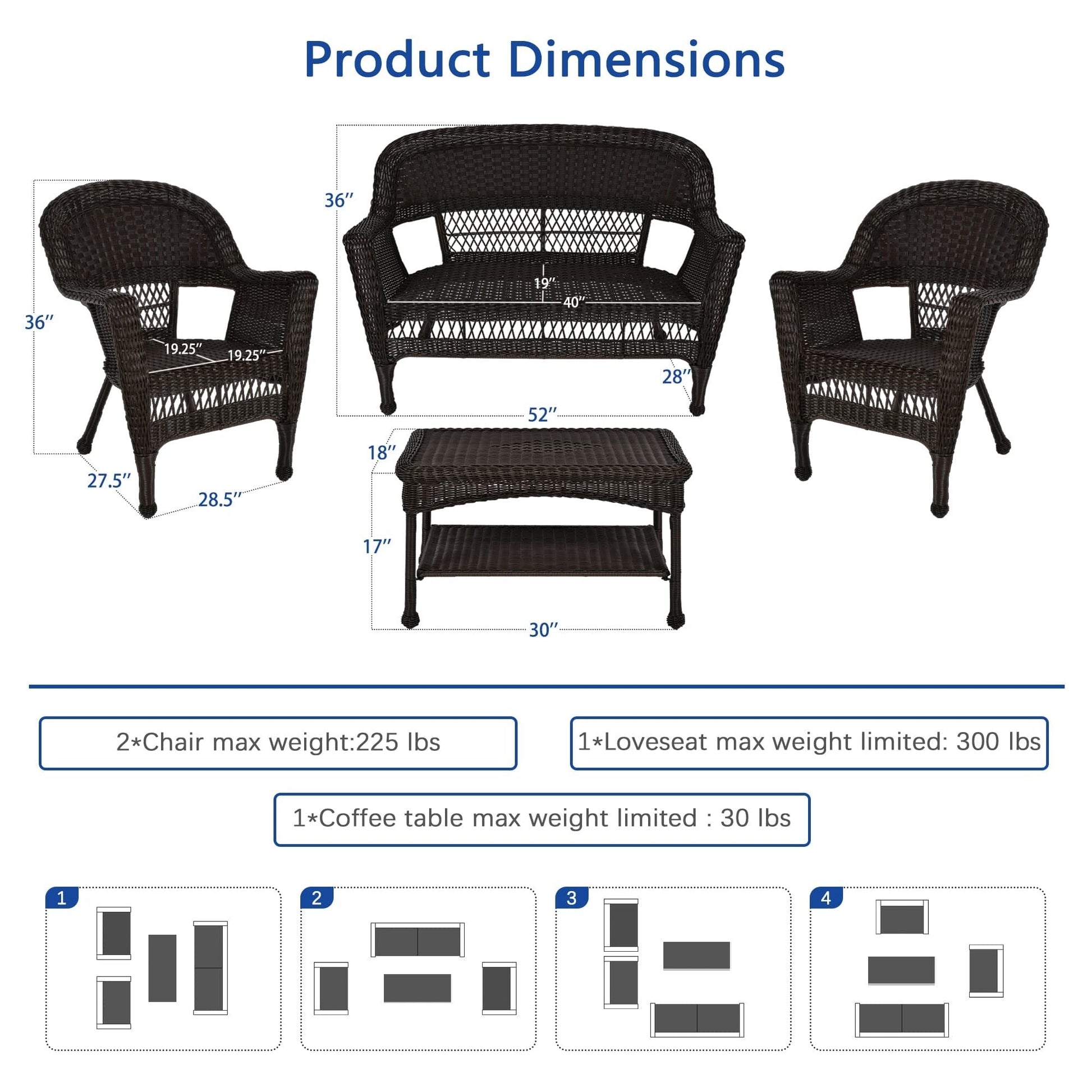 - Comprend un canapé, deux chaises et une table basse.