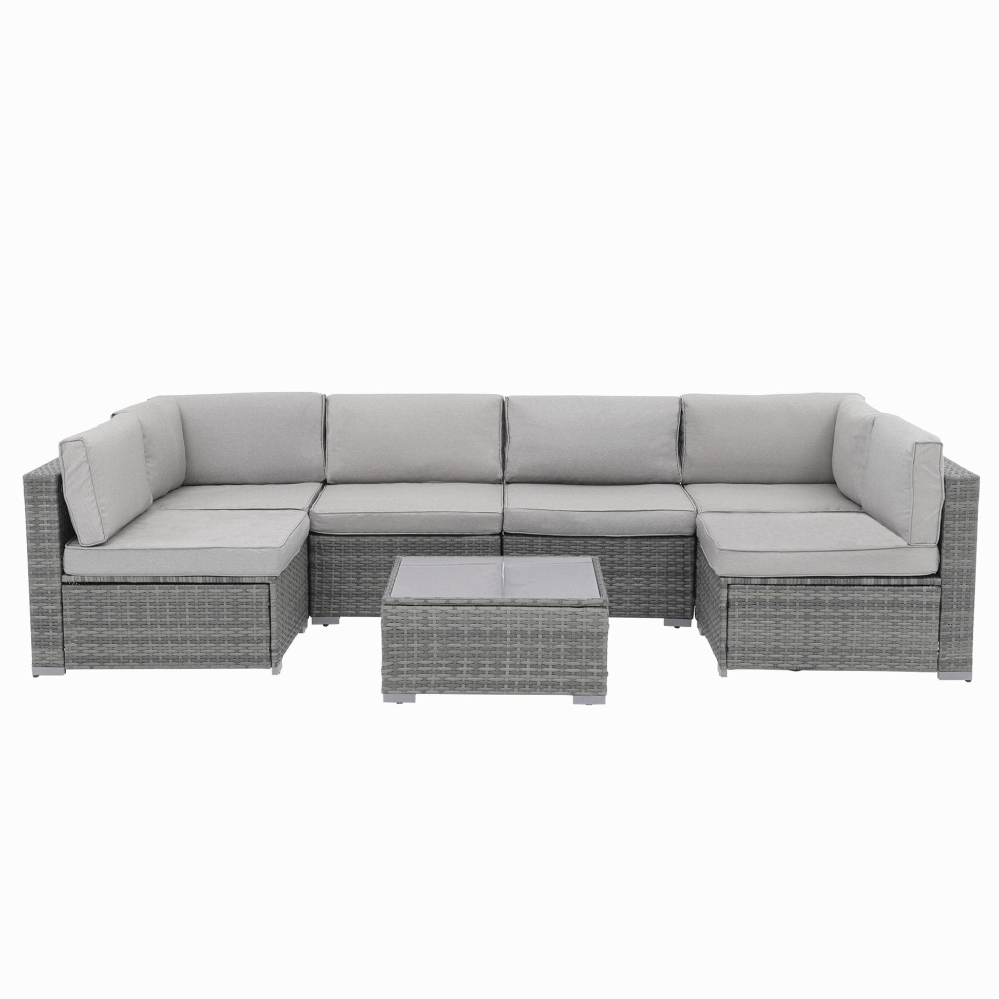 Add elegance and comfort to your outdoor space with the Wicker/ Steel 7-piece Outdoor Cushioned Sectional Sofa Set. The set features a sturdy steel frame wrapped in durable wicker that resists rust and outdoor elements. Cushions on each seat provide maximum comfort. With easy assembly and multiple configurations available, you can customize the set according to your needs.  In addition, a side table is included for added functionality and decoration.